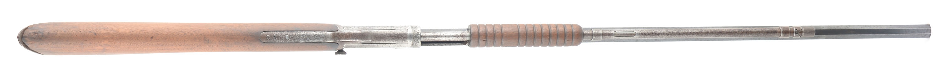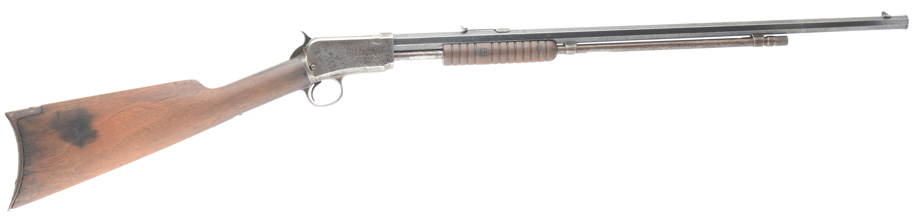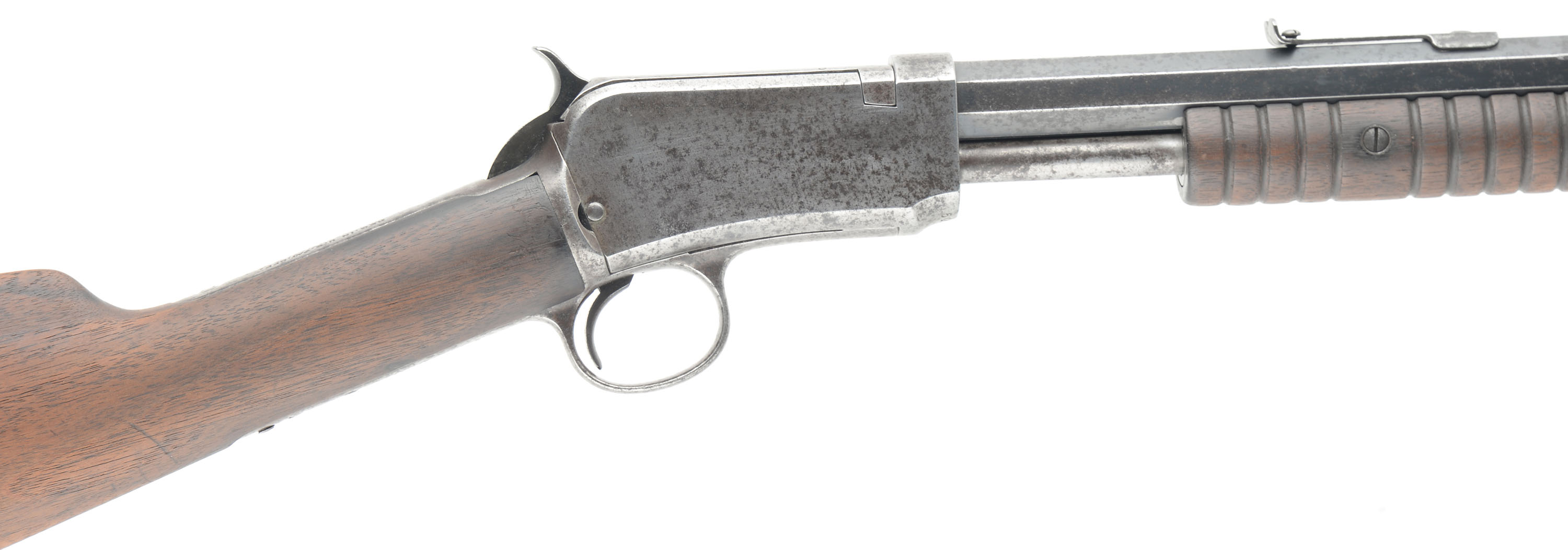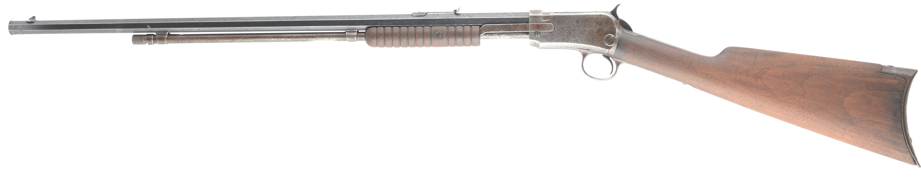 Winchester, Model 90, .22 LONG RIFLE Cal., MFG: 1912 SN: 501210, Slide Action Pump, 24'' Tapered octagon barrel. The L.R, only caliber is the rarest & most desired caliber amongst collectors as only 10% of total production was this caliber. The L.R. caliber was added in the 1890 line-up in 1919. The barrel on this rifle has a ''P'' proof stamping indicating it is a later replacement after the LR only caliber was added. The original wood stocks are very good, but were sanded long ago & then reoiled. There are some minor handling marks or contusions remaining, & some dark staining. The original metal blue finish rates 70% on the barrel, but with lots of speckling or cleaned pitting. The receiver & mag tube are gun metal gray, with a spotty has a thin brown patina, with spotty brown patina. Bore is excellent. The barrel carries the original adjustable rear sight & blade front sight. Factory crescent steel buttplate. Likely a great pump rifle shooter. FFL or C&R Req. - Value: 400 to 800