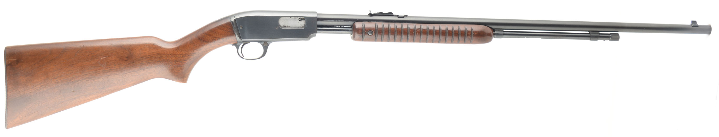 Winchester, Model 61, CAL: 22 S, L & LR, MFG: 1950, SN: 142379, Pump Action Take-down Rifle. 24'' tapered round barrel. The factory flat knob pistol grip wood stocks are excellent, displaying few minor contusions or scuffs to the excellent original finish. There is a small corner chip next to the pump release button on the wrist & a tight 2'' crack on the belly of the forend. The original metal blue finish rates 95% on barrel & mag tube, 90% on the receiver, with spotty loss on the receiver. Bore is excellent. Standard open sights. Factory checkered metal buttplate. Overall, an excellent condition & beautiful 61 rifle. FFL or C&R Req. - Value: 600 to 1000