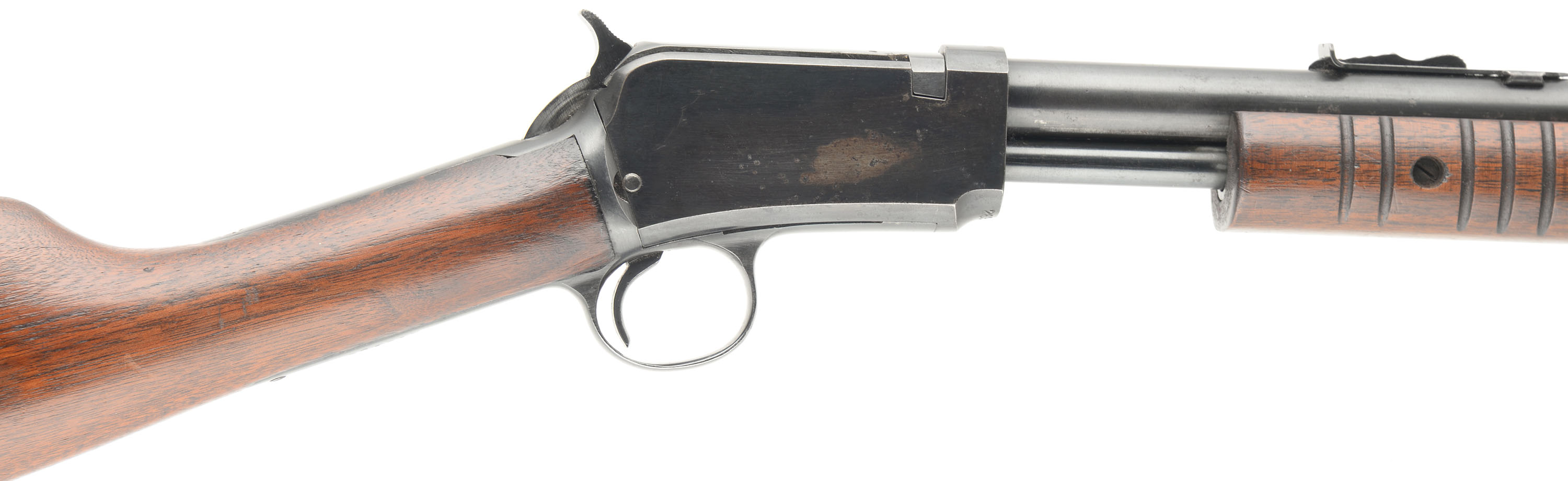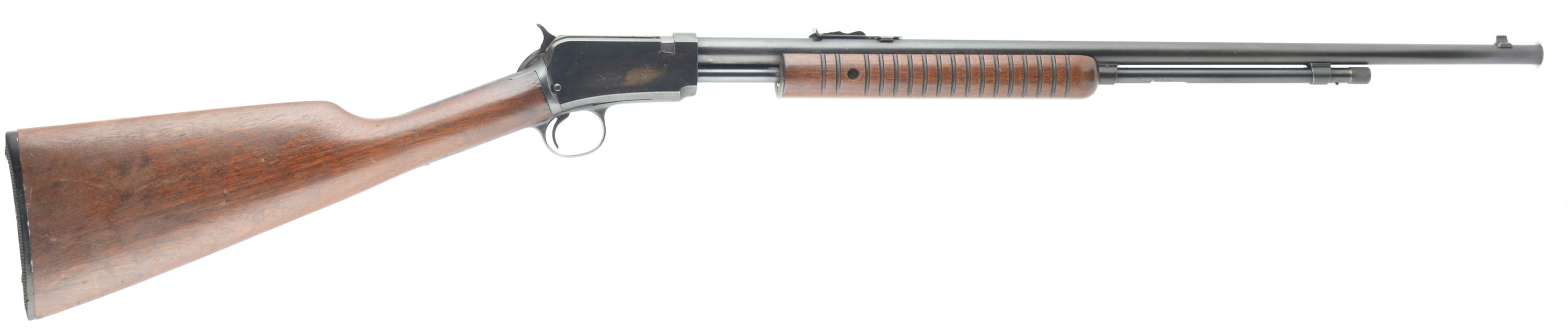 Winchester, Model 62A, CAL: 22 S.L.LR, MFG: 1949, SN: 269019, Pump Action Rifle, 23'' barrel. The original straight grip wood stock & corncob style forearm are excellent, with light contusions, surface scrapes & scratches to the original factory finish. There is some black staining & spotting to the wood. The original metal blue finish rates 70% overall, with some speckling & cleaned light pitting. Bore is excellent. The barrel holds an adjustable rear & blade front sights. Buttstock carries a Winchester marked, checkered black plastic buttplate. Overall appearance is very good. FFL or C&R Req. - Value: 600 to 1000