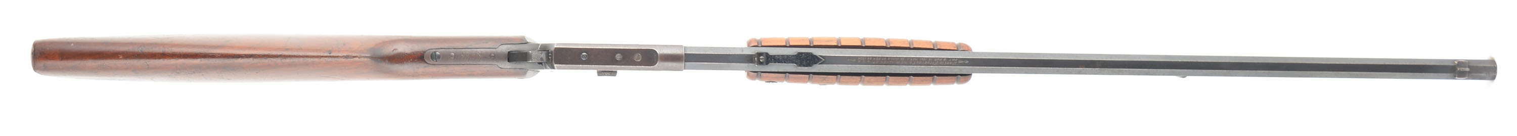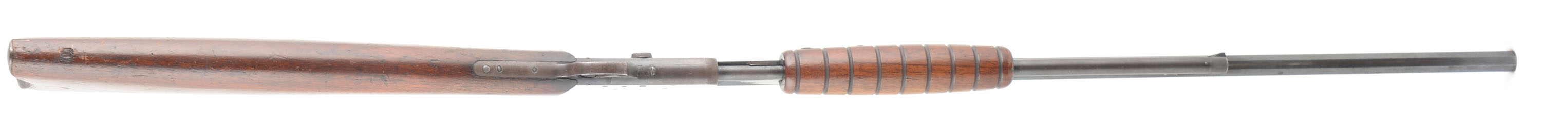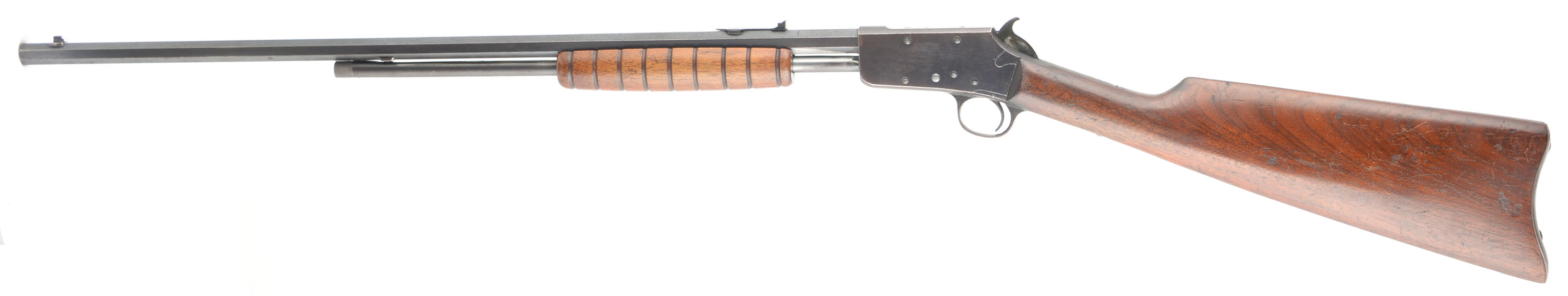 Marlin, Model 20, .22 S. L. & LR. Cal., MFG: 1906-22, SN: NVS, Pump Rifle, 22'' Octagon barrel, 2/3rd Tubular mag. Take-down. The original straight grip wood stocks are very good & solid, with numerous minor to small contusions, scratches & scrapes to the wood & original finish, which is thinning from use. The factory metal blue finish rates 70% on the barrel, while the receiver & mag tube have good coverage of an even brown patina. Barrel is mounted with an adjustable rear & blade front sights. Bore is good, with some cleaned pitting & roughness amongst solid rifling. The stock carries the original smooth curved metal buttplate. Rifle action function smooth & properly. A nice looking original example. FFL or C&R Req. - Value: 300 to 600