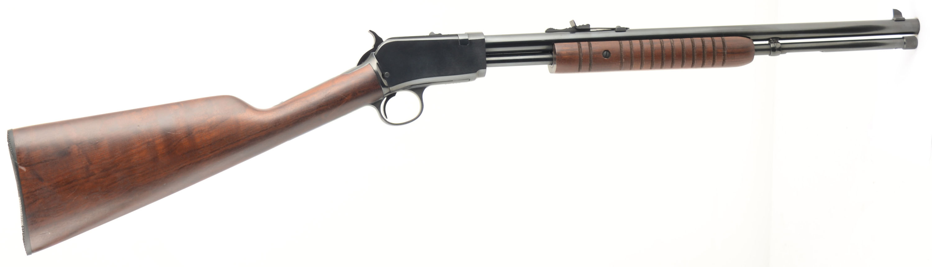 Taurus Model 172, marked .17 HMR, MFG. Modern, SN:WE2103, Pump Action Rifle, 16 1/2'' round barrel. Taurus' modern version of the famous Winchester model 62 rifle, but in the smaller .17 HMR caliber. The original straight grip wood stocks are excellent, with a couple of very minor rubs or surface blemishes to the original factory finish. The original metal blue finish is 98% overall. Bore is excellent. Barrel fitted with factory sights. Original checkered plastic buttplate. The forearm is the larger corncob style. An excellent original example. FFL Req. - Value: 200 to 300