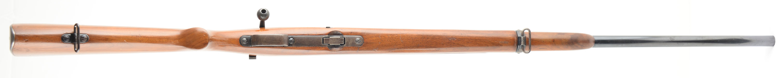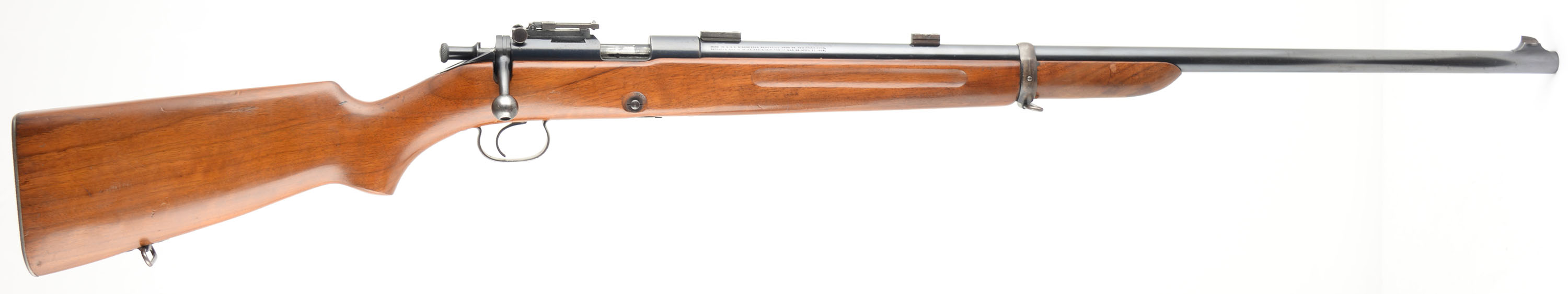 Winchester Model 52, CAL: 22 LONG R., MFG: 1927, SN: 13694, Bolt Action Rifle, 28'' barrel. The original target/military style & flat pistol grip wood is excellent. It has the finger grooved forend, with the military style barrel band. There are some minor scrapes, scratches & contusions to the orginal finish. The original metal blue finish rates 85% overall, but with additional wear on the trigger guard & floorplate. Bore is excellent. The rifle comes fitted with a multi adjusting receiver mounted ladder sight in the factory dovetail & raised front blade sight. The barrel has two blocks for scope mounting. Buttstock carries the original checkered metal buttplate & sling loops. Original ''Winchester'' marked detachable mag. An excellent target rifle. FFL or C&R Req. - Value: 600 to 1200