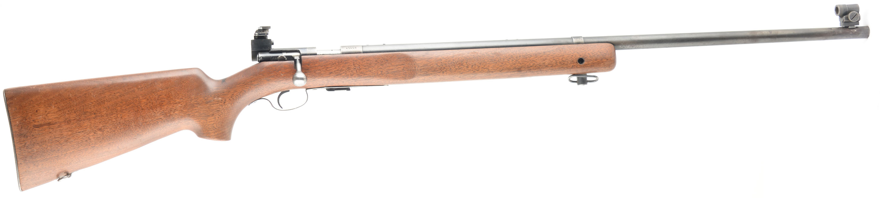 Winchester, Model 75 Target, CAL: 22LR, MFG: 1942, SN: 41658, Bolt Action Rifle, 28'' barrel. The original flat pistol grip target stock is excellent, with light scratches, scrapes, & contusions to the original finish. The original metal blue finish rates 30% overall, with the trigger guard worn mostly to metal gray. Bore is excellent. The receiver has a side mounted multi adjustable Lyman receiver sight, while the barrel holds an multi adjustable large hooded front post sight. Top of barrel is tapped & drilled, with (4) filled screw holes for scope mounting. Stock carries a checkered metal buttplate. Sling swivels. Original ''Winchester'' stamped mag. FFL or C&R Req. - Value: 500 to 1000