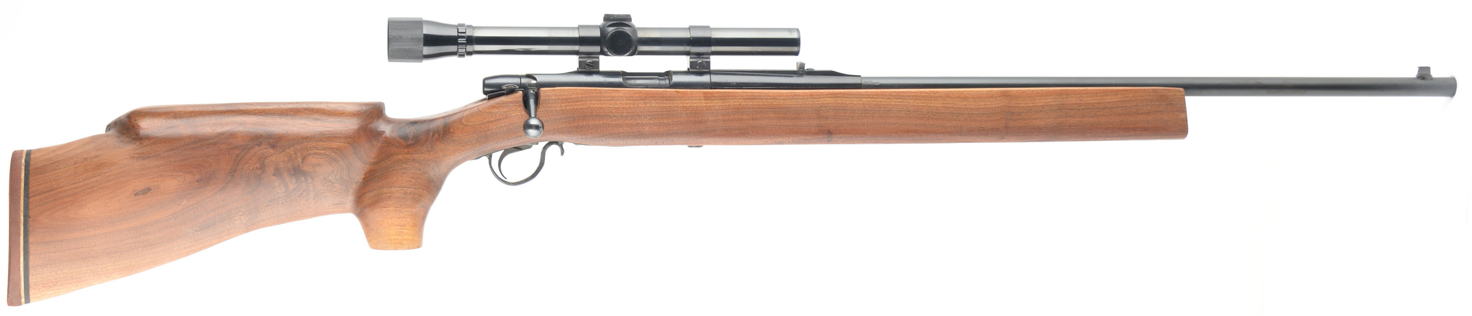 Custom Remington, Model 580, .22 S. L. or LR Cal., MFG. 19757, SN: 1215575, Bolt Action Single Shot Rifle, 24'' round barrel. The customized replaced, high comb, dished cheek & flat pistol grip wood stock is excellent., with very few handling marks to the excellent finish. The original metal blue finish rates 95% overall, with some light speckling. Bore is excellent. Fitted with a Weaver D6 scope & factory open sights. Solid rubber recoil pad. FFL or C&R Req. - Value: 200 to 400