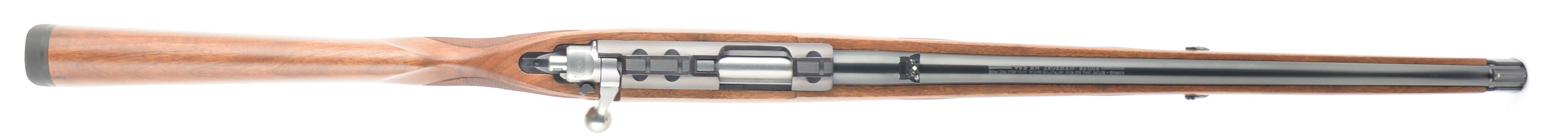 Ruger, Model 77/22, CAL: 22 WIN MAG., MFG: 2014, SN: 703-75408, Bolt Action Rifle, 18.5'' barrel. The original checkered & Ruger logo capped pistol grip Mannlicher style walnut stock is excellent, with virtually no handling marks to the original excellent finish. The original metal blue finish rates 99% overall, with the receiver toning the typical Ruger plum. Bore is excellent. The receiver has integral scope mounts machined directly into the solid steel receiver, while the barrel carries a folding leaf rear & factory front sights. Buttstock carries a Ruger logo solid rubber recoil pad. Sling studs. Factory detachable mag. Excellent overall. FFL Req. - Value: 600 to 800