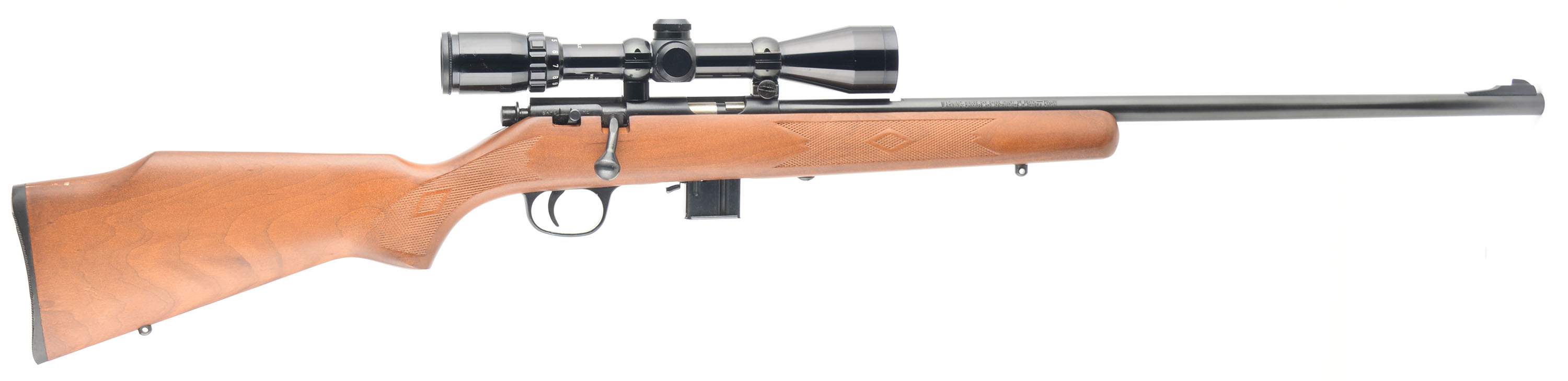 Marlin, Model 25MN, .22 WMR Cal. ONLY, MFG. Modern, SN: 00366040, Bolt Auction Rifle, 22'' round micro grooved barrel, 7 shot mag, The original checkered & flat pistol grip wood stock is excellent. The original metal blue finish rates 99%. Bore is excellent. Fitted with a Bushnell Sportsview 3X-9X, 40, while the barrel has an open rear dovetail & front ramp sight. Stock carries a Marlin plastic buttplate & sling studs. FFL Req. - Value: 250 to 500