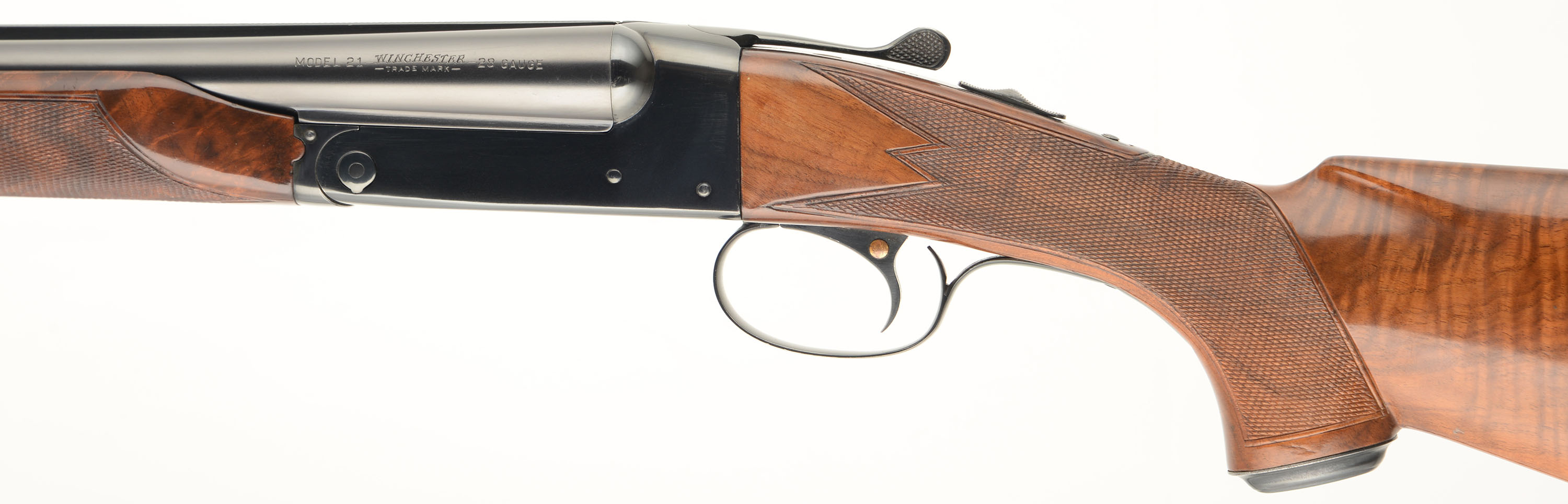 HISTORY: The Winchester Model 21 is widely viewed as one of the most elite American boxlock double guns ever produced. It was technically a production gun until 1960, but each Winchester Model 21 was custom-crafted. The Winchester Model 21 was developed to compete not only with luxury American shotguns offered by companies like A.H. Fox & Parker Brothers but to rival the English side by sides too. British sportsmen preferred lighter weight & lighter loads. The Model 21 was engineered for power & durability.