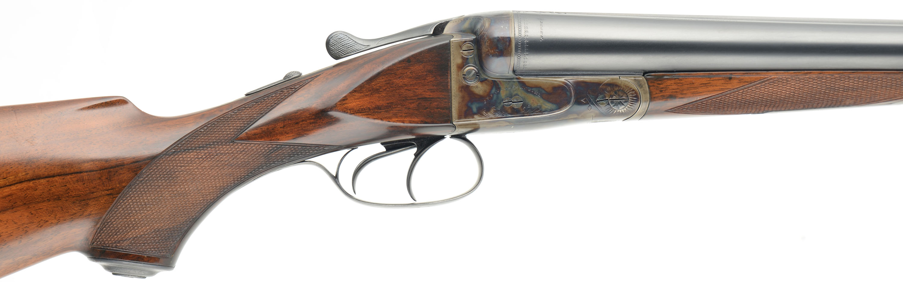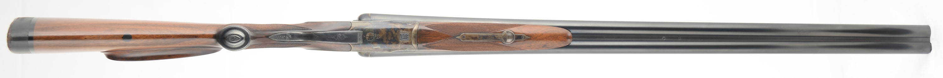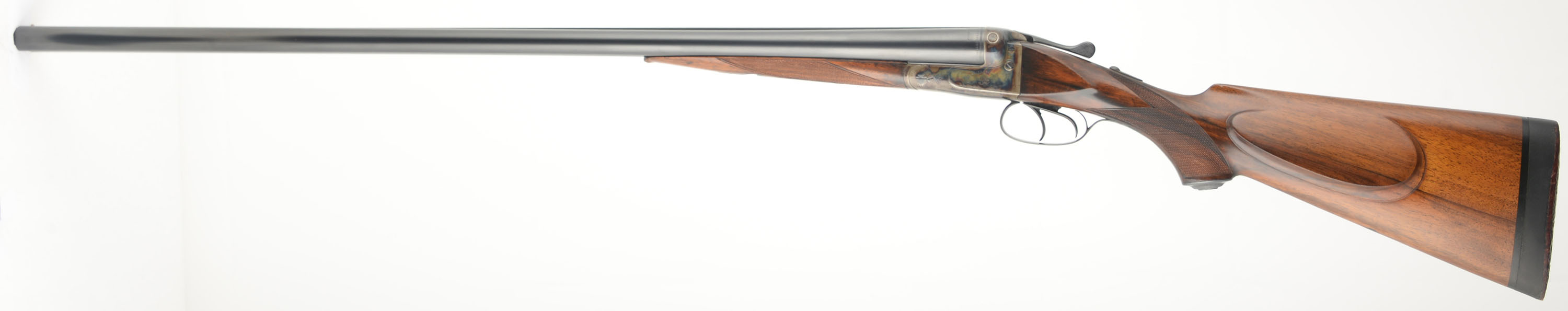 JP Sauer & Sohn, SxS Shotgun, CAL: 12GA, MFG: 1920's, SN: 215487, Break Action, 29 3/4'' barrels. This gun has been fully & professionally restored by R.L. Mathens in 1940's. The original stocks are excellent. They feature checkering, an engraved metal grip cap & beaded cheek. There are only minor handling marks to the applied finish. There is a dowel fill in the belly of the stock from a sling stud provision & there are two filled screw holes in the bottom rib for sling loop. The metal blue finish on the barrels rates 98%, with cleaned pitting underneath the re-blued finish. The case-hardened receiver & forend release lever have excellent, vivid case-colors. Bores are excellent, with minor wear from use. The solid matted rib holds a single front bead. Stock has a solid black rubber recoil pad with an aged leather butt end. Dual triggers. Mechanically excellent. A very nicely restored German shotgun. LOP: 14 3/4'' overpad to front trigger. FFL or C&R Req. - Value: 1000 to 2000