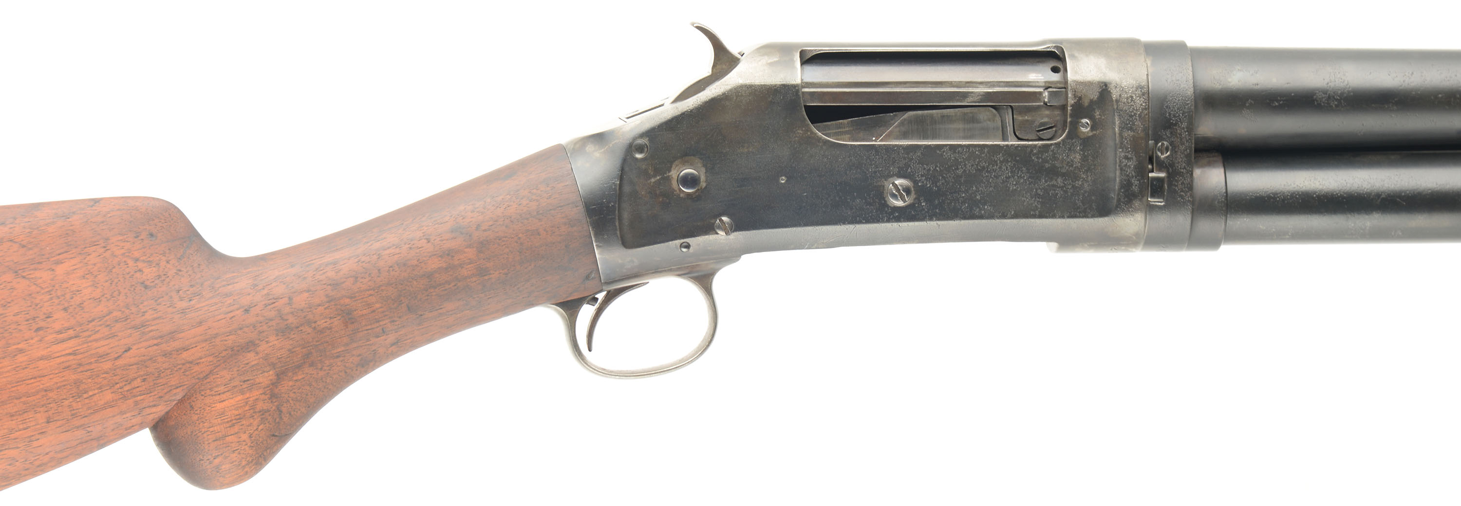 Winchester, Model 1897 Take-Down, CAL: 12 GA, MFG: 1904, SN: 268266, Pump Action Shotgun, Choke: Marked Full, Now CYL, 2 3/4'', 20 3/4'' cut down barrel. The original round pistol grip stock & corncob forend are good & solid, however there are two 3'' cracks at the toe. The original finish has worn away, with added oils. There are minor to small scrapes, scratches & contusions to the wood & finish. The metal black refinish rates 70% overall, but with cleaned rust pitting below the finish on all surfaces. Bore is good. Barrel holds no front bead. Stock carries the original checkered widow's peak metal buttplate. LOP 13 3/4''. FFL or C&R Req. - Value: 200 to 400