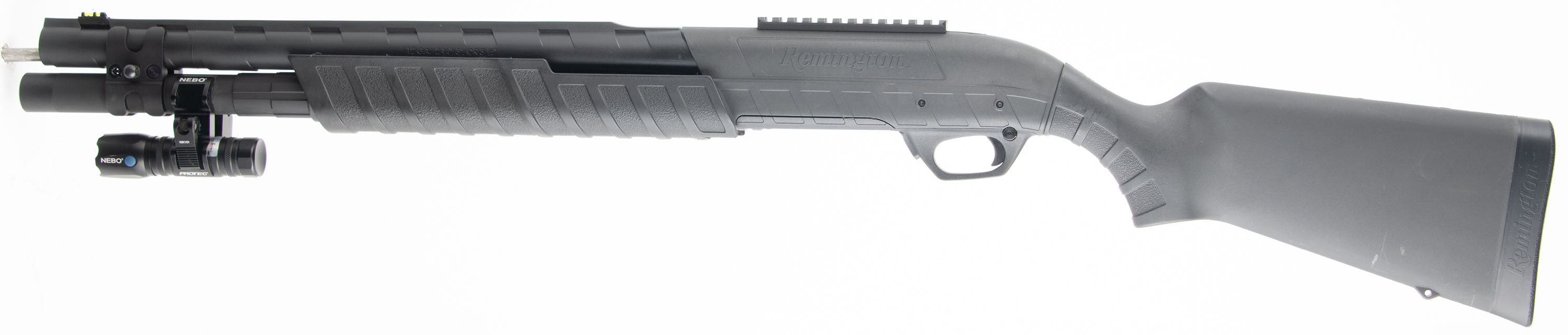 Remington, M887 Nitromag, CAL: 12 GA 2 3/4'', 3'', Or 3 1/2'', MFG: Modern, SN: ARM012083, Pump Action Shotgun, Choke: Thread in Choke (Missing), 18 1/2'' Barrel With a Plastic Rib and Barrel Shroud. The plastic stock and forend are in very good condition with some handling wear. The black finish on the gun is very good with some wear. Bore is very good, very bright throughout and smooth through most of the bore with some roughness in the middle. Mechanically solid, seems to function well. The rib holds a fiber optic front sight. There is a picatinny rail on the top of the receiver. The stock has a sling hole and the barrel clamp has a sling stud and picatinny rail. The magazine tube has an extension. There is a Protec Nebo light clamped to the magazine tube extension. The stock has a factory Remington recoil pad. LOP is 13 3/4'' over pad. FFL Req. - Value: 100 to 300