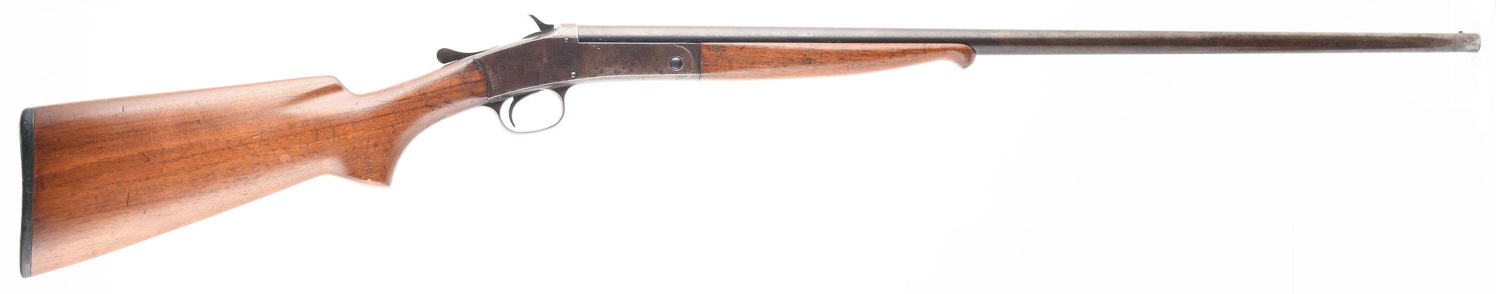 Winchester, Model 20, CAL: 410 GA, MFG: 1920-24, SN: 640, Tip Up Single Shot Shotgun, Choke: Full (Measures IM), 26'' Barrel. The wood stock is very good, solid with some handling wear, dings, scratches, and light edge chips. The blued finish on the gun has worn and toned to a mix of gun metal grey, brown patina, and original blue. Bore is fair, bright with substantial pitting near the chamber. Mechanically solid, seems to function well but is slightly stiff. The barrel holds a front bead sight, the frame has a rear sight notch cut into it. The stock has a checkered plastic Winchester buttplate. LOP is 13 1/4''. FFL or C&R Req. - Value: 200 to 500