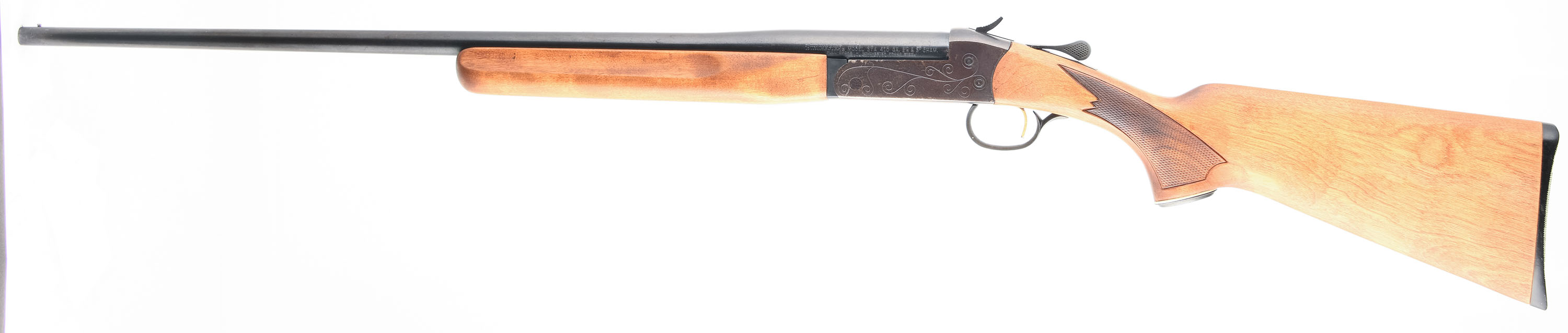 Winchester, Model 37A, CAL: 410 GA 2 1/2'' or 3'', MFG: 1973-79, SN: C528173, Tip Up Single Shot Shotgun, Choke: Full, 26'' Barrel. The checkered wood stock and forend are excellent, solid with light handling wear. The blued finish on the frame has toned to a brown patina with some exposed gun metal grey in on the corners. The blue on the barrel has some rust speckling and very light speckled clean pitting. Bore is excellent, bright with very light roughness near the chamber. Mechanically solid, seems to function well. The barrel holds a front bead sight. The stock has a checkered plastic Winchester buttplate. LOP is 14''. FFL Req. - Value: 150 to 400