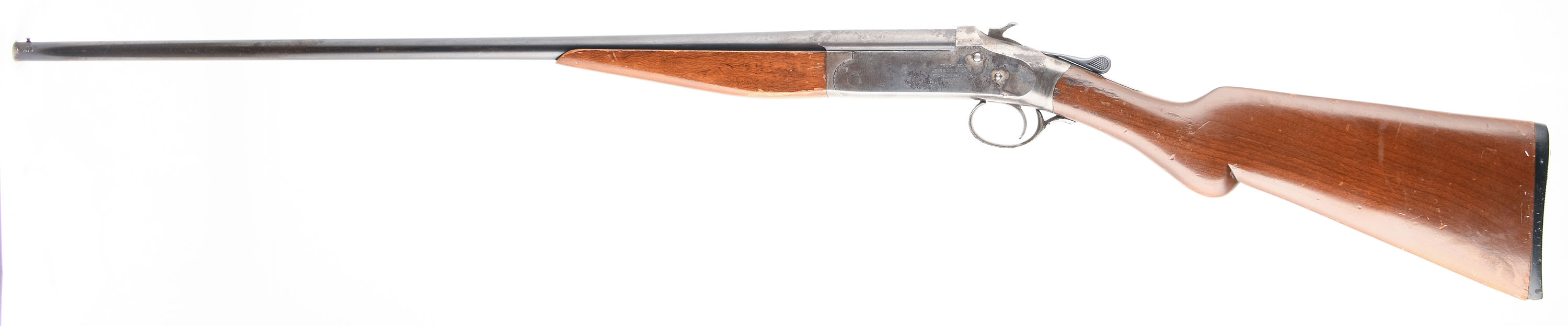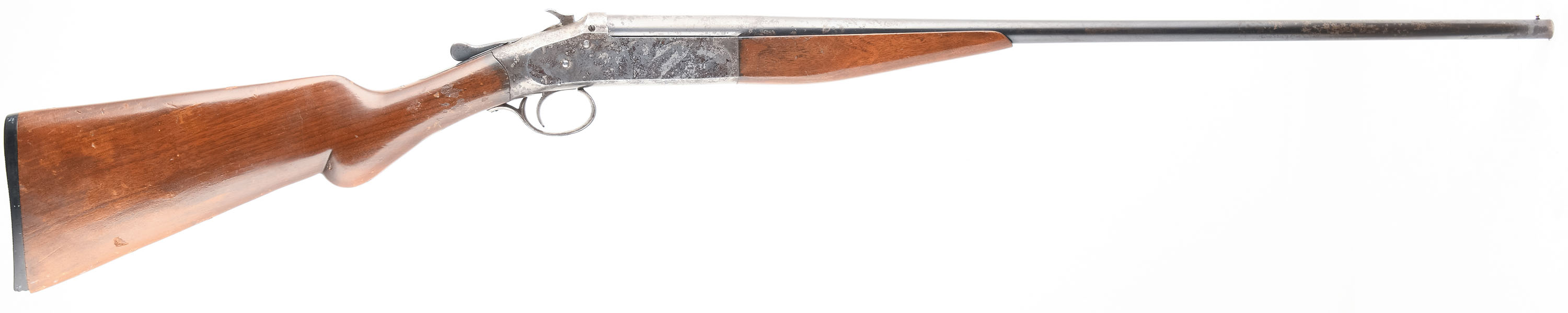 Iver Johnson, Champion, CAL: 410 GA, MFG: 1916-57, SN: 36667, Tip Up Single Shot Shotgun, Choke: Imp Mod, 26'' Barrel. The wood stock and forend are good solid with some chips, dings, and scratches. The receiver has worn to a gun metal grey with substantial clean rust pitting, patina, and speckled rust. There are some shadows of case hardening. The barrel has worn and toned to a mix of gun metal grey, original blue, and brown patina with some rust speckling and substantial clean rust pitting. Bore is very good, bright with light roughness near the chamber. Mechanically solid, seems to function well. The barrel holds a front bead sight, there is a rear sight notch cut into the top of the receiver. The stock has a factory Iver Johnson serrated plastic buttplate that has a large chip at the toe. LOP is 14''. FFL or C&R Req. - Value: 80 to 200