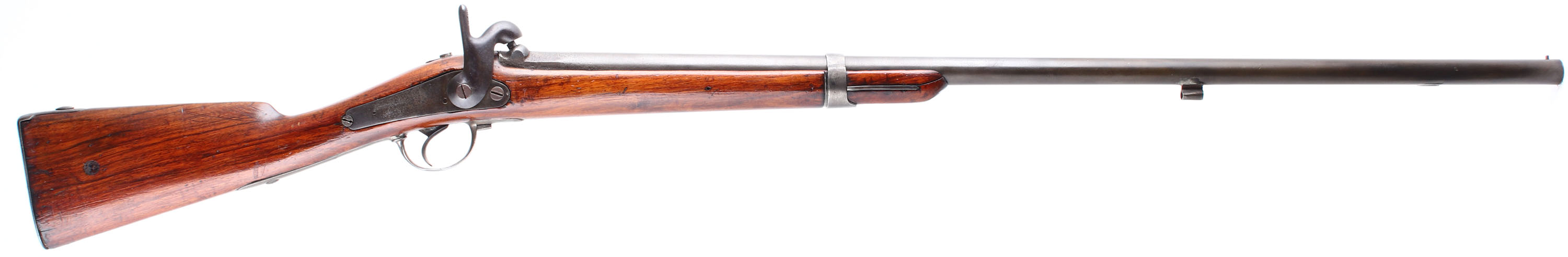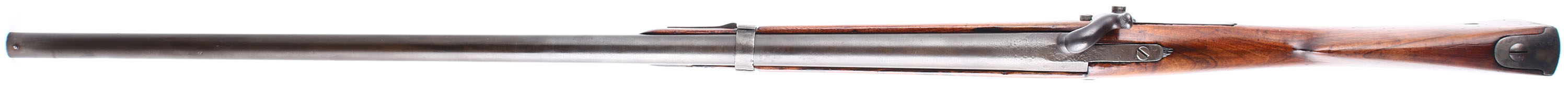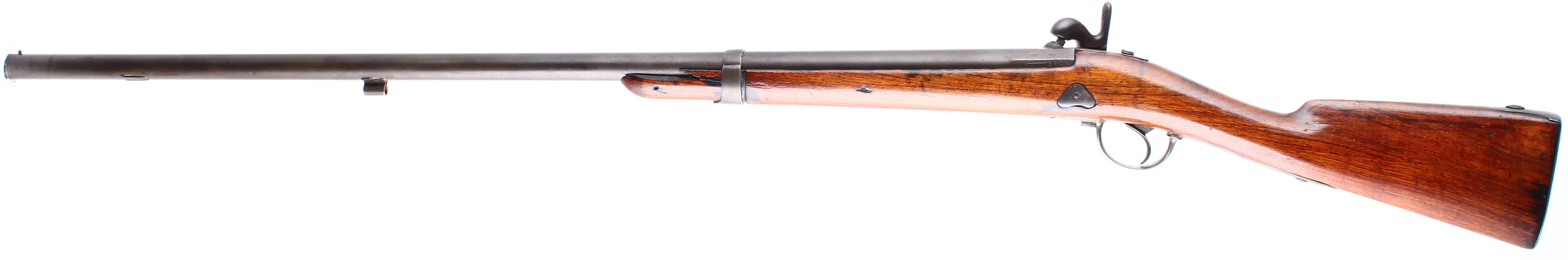 HISTORY: This rifle started life as MLE 1822 .69 Caliber (17.5mm) smooth bore flintlock musket. After France adopted the MLE 1840 which switched from a flintlock Charleville style action to the percussion ''Back Action''. France would in turn start converting older flintlocks with the new Percussion system, converted rifles are noted by having a ''T'' for Transformed added to the model on the gun. These systems were all .69 Caliber smooth bores. In 1846, French Military Instructor & Inventor Claude-Etienne Minie would invent the Minie Ball Which allowed Rifles to be loaded as quickly as smoothbore musket, but retain their rifle accuracy. France would later issue their first Rifled musket for the mainline infantry the MLE 1857 & the older smoothbores were rifled, making their bores 18mm, these would be marked 18mm & have a T added onto it model. Frane went through many small updates & changes during this time with their muskets & rifles so there are a lot of small variations of markings & style from surviving guns. Large numbers of these French muskets were imported just before & during the civil war for both the Union & Confederacy. People had mixed opinions on them because the rifles were a mix of perfectly fine rifles, & some which were unsafe to shoot. France was starting to switch to a breech loading rifle at this point so saw the Civil war as the perfect opportunity to off load all their unwanted older muskets, leading to them being in different states of disrepair, some being smoothbores, some being converted rifles, some older flintlocks, & converted percussion guns. France would later convert many of their muzzleloaders to a breech loader with the Tabatieres system. These would see use with France during the France Prussian war of 1870 alongside the MLE 1866 Chassepot. Many of these were converted to shotguns mostly in Belgium but some were done in France, & then sold on the US market around 1880's-1900 as cheap trade shotguns usually under the name ''ZULU'' or ''HUNTER''. This rifle here appears to be a Mle 1840 that was later bored with rifling, but the barrel & barrel tang markings are illegible.