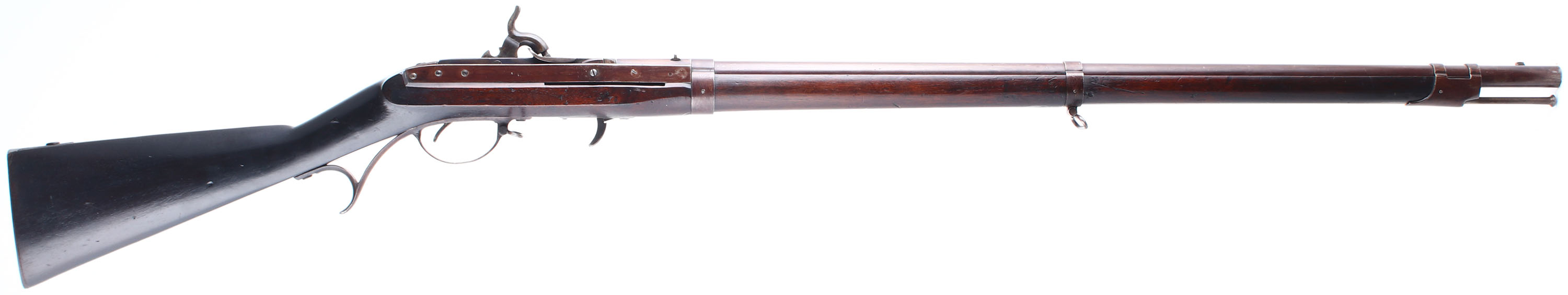 HISTORY: Designed by John Hancock Hall. The Hall rifle was the first breech-loading rifle to be adopted in large numbers by any nation's army. Instead of having to load from the muzzle, the chamber can pivot up & you can load your ball & powder from there. This made reloading faster in general & since you did push the bullet through rifling to load, being rifled or smooth bore did not affect reloading speed. The army conducted tests & found it was more accurate than their rifles & reloaded faster than the smoothbores. Carbines were produced starting in 1833, these had smooth bore barrels & were the first Percussion arm adopted by the US. New rifles would be produced with the percussion lock & older rifles would be retrofitted. The rifles would see updates through the years until production stopped in 1844. These were used in US conflicts up till the civil war, basically they were used until they wore out. Some were sold to Argentina when the US started replacing them with sharps & The Buenos Aires State Forces would use them in small numbers clear until 1881. Thousands of rifles were made, though the troops and many leaders preferred the simplicity and lower costs of muzzle-loaded weapons, but the advantages were clear, & its influence paved the way to new breech loading designs. John Hall built his own shop (Hall rifle works) & machines at Virginius Island on the Shenandoah River, just around the corner from Harpers Ferry located on the Potomac River. He built the rifles with the brand-new concept of interchangeable parts & would pioneer the concept for the whole world. Hall was able to start producing the rifles at his factory starting in 1824 & would receive a contract for 1,000 rifles. He would quickly get another contract for 1000 as the rifles from the other order were being delivered. The need for the rifles would soon outgrow Halls factory & Simeon Noeth of Middletown CT would get a contract for Hall rifles, but the parts had to be completely interchangeable with the Harpers Ferry guns. He was able to achieve this & started making rifles in 1830. North would end production with Hall carbines in 1853. This was the first time in history that rifles from two different manufacturers had completely interchangeable parts. between the two manufactures about 50,000 hall rifles & carbines were produced.