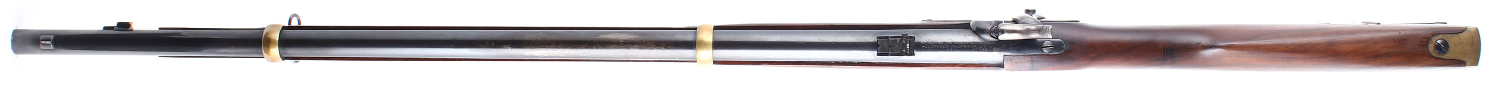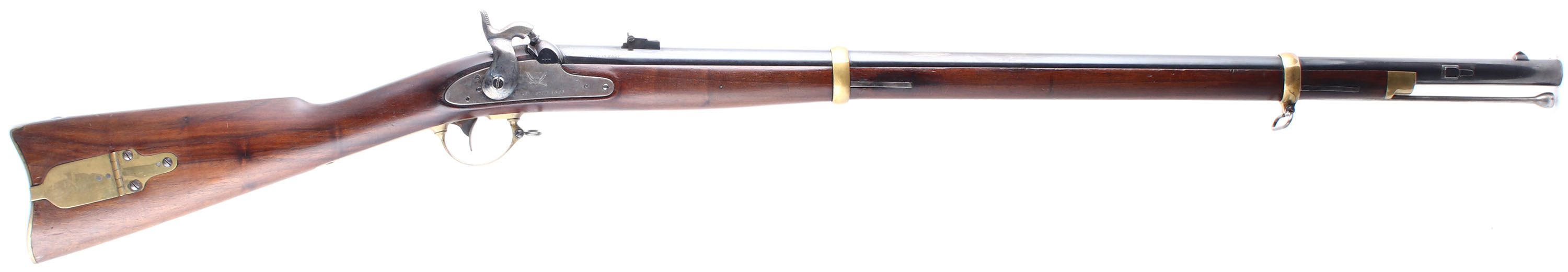 CONDITION: The straight wrist walnut stock is very good near excellent with light nicks. dings, & scratches from use/age. Brass patch box in right cheek of stock. The barrel has been re-blued leaving some markings faded. Blue rates 87% with thinning starting to tone brown by the action & between both barrel bands. The lock has thinned remnants of a case-hardened finish around the hammer. The rear of the barrel is marked with the S/N, Italian Proofs, the Hy. Hunters address stamp & ''MADE IN ITALY''. Lock plate marked with a American great eagle & ''REMINGTON 1863''. The bore is Excellent. Bright & shiny with minor wear from light use. Three-groove rifling. The barrel holds a barleycorn front sight with a three-leaf U-notch rear sight. The stock carries a brass buttplate, has light patina. The rifle has both sling loops & a metal ramrod. Hammer locks in half & full cock, trigger will release hammer in half-cock. Muzzleloader, No FFL Req. - Value: 250 to 500