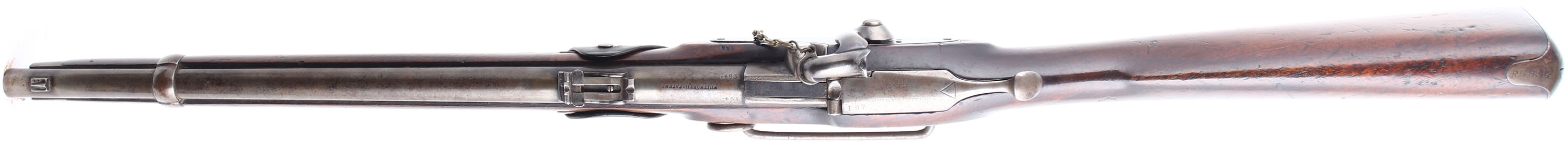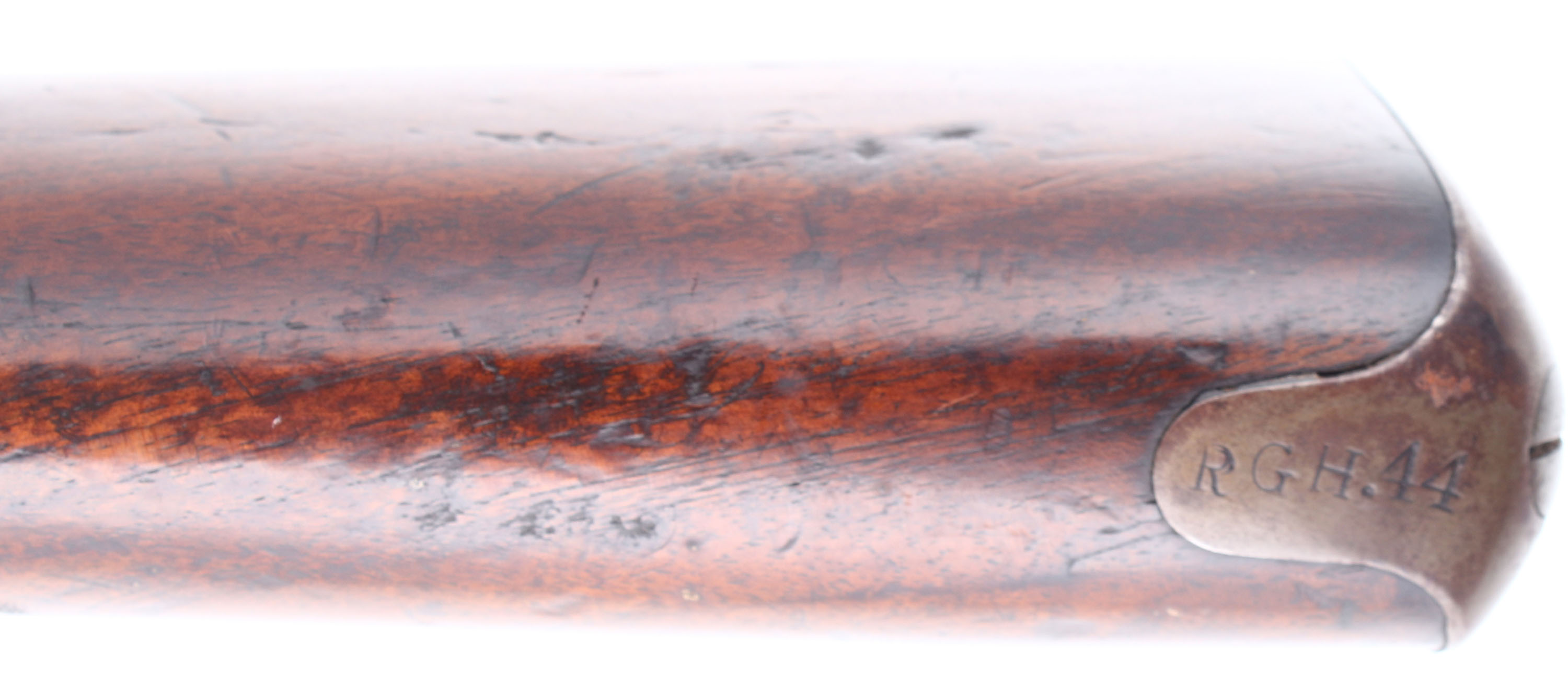CONDITION: The straight wrist walnut stock is very good with various nicks, dings, dents, & scratches from use/age. Wood has added oils on it over time. Wood has slightly shrunk from time & the buttplate is slightly proud to the wood at the toe & upper extension of the buttplate. The bottom of the wrist, just below the lower tang, has a faint ''197'' stamp (S/N). The metal has toned to a mix of gun metal gray & light brown patina with spots of thinned blue remining in spots along the stock line, front/rear sight, & protected areas. The lock plate has a arsenal re-blue & rates 90% with some thinking, has light roughness in spots under finish. Most markings are worn/faded from wear & age. The barrel is marked ''.451'' over ''72'' on the left, ''WHITWORTH PATENT'' at the top, & ''.483'' on the right. Just ahead of the rear sight on the barrel is a heavily faded marking, worn illegible, only faint outline remains. The left side of the chamber is marked with two ''52'' bore (gauge), bore measurement, three British proofs, the S/N, & a small ''OO'' over ''S'' stamp. The top of the chamber is marked ''480'' & ''O''. The right side of the chamber is marked ''P''. The top of the breech cover is marked ''WESTLEY RICHARDS '' over ''PATENT'', & the S/N. The lock plate is marked ''WESTLEY RICHARDS & CO.'' over ''1861''. The upper extension of the buttplate is marked ''RGH.44'', this is for the Royal Gloucester Hussars rifle No.44. The bore is very good. bright & shiny with some roughness throughout the bore. The barrel holds a barleycorn front sight with a stepped base/ flip up ladder, V-notch rear sight. Base I marked 2 to 4, ladder marked 1 to 8. Rear sight has the leather cover, has two cracks at the top & slightly stiff, still can swing up & cover the sight. The stock carries a steel trapdoor buttplate that's toning to a brown patina, nothing inside trapdoor. Left side mounted sling bar & ring. Rifle has the correct cleaning/clearing/ram rod, & nipple protector on chain. Antique, No FFL Req. - Value: 2000 to 6000