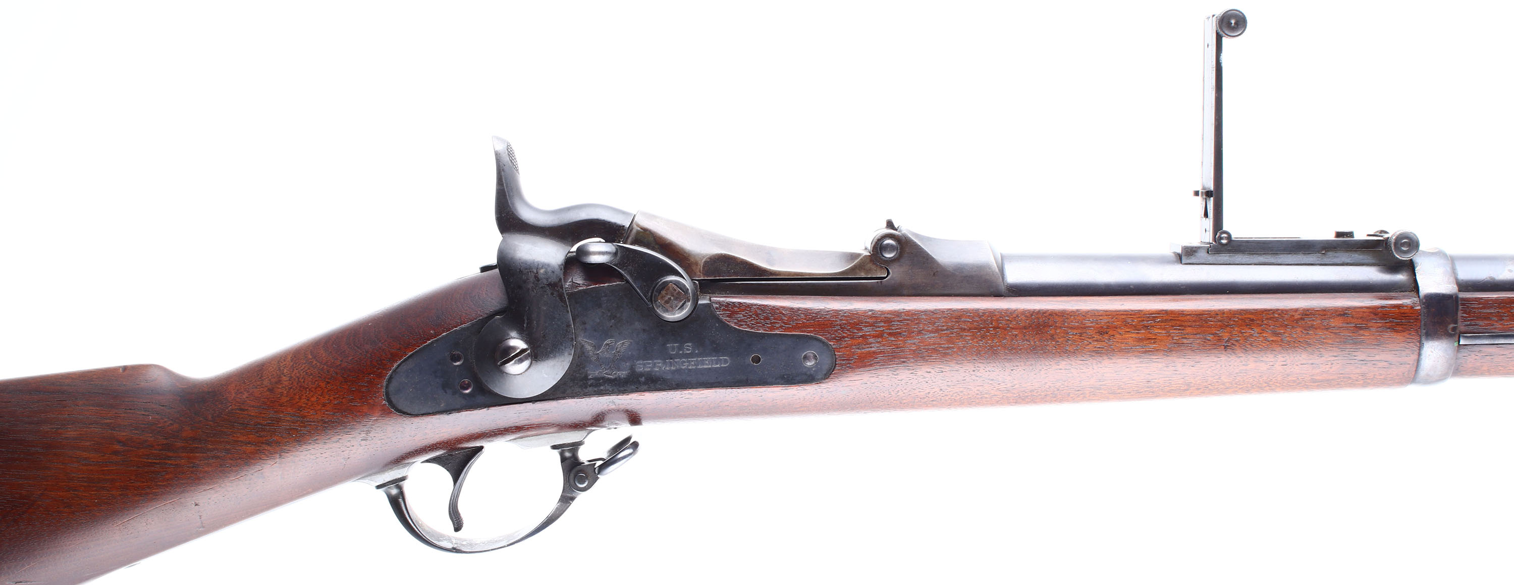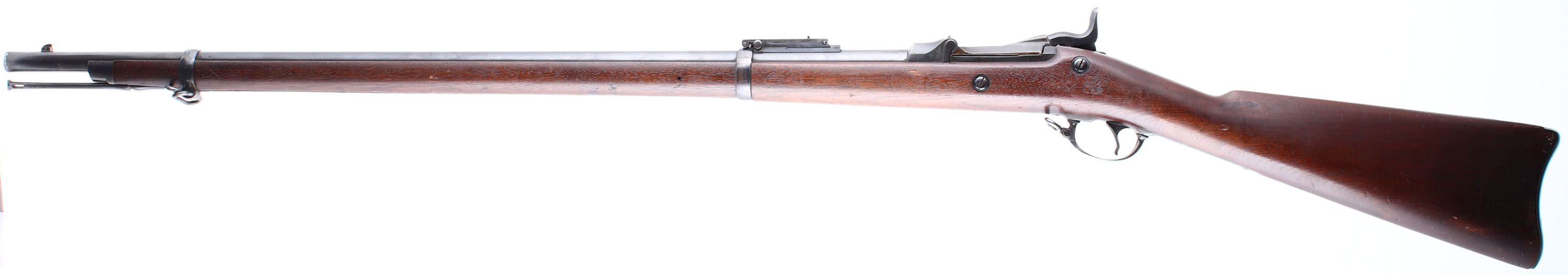 CONDITION: The straight wrist American black walnut stock is very good near excellent, but has some nicks, dings, & scratches. stock has added oil/finish. Metal to wood fitment is solid & the wood doesn't appear to have been sanded or seen heavy wear. Left side of the wrist stamped ''SWP'' over ''1889'' in a box inspector/acceptance cartouche. Metal has been re-blued/re-finished. The blued finish on the barrel rates 92% with spots of light thinning, light scratches & wear at the muzzle. The blued finish on the receiver rates 90% with spots of light thinning & some roughness under the finish. The breech block & rear barrel tang retain faded case-hardened finish with spots toning brown. The inside of the breech block retains deep case-hardened finish. The lock plate has full blue coverage with spots of thinning. The top of the breech block is marked ''US'', ''MODEL'', ''1884''. The rear of the receiver is stamped with the S/N, stamp is faded. The chamber is marked V over ''P'' over a eagles head, ''P'', ''A'', some marking slightly faded from re-blue job. The lock plate is marked with a American Great eagle stamp, ''U.S.'', ''SPRINGFIELD'', markings are slightly faded from re-blue. Upper extension of the buttplate marked US''. Both barrel bands marked ''U''. Oval knurling on hammer, serrated trigger, & has the ''three-click'' action. The bore is excellent. Bright & Mirror like with little visible wear. The barrel holds a small blade front sight with a Buffington, U-notch ladder rear sight. The stock carries a blued steel buttplate, mix of gun metal gray & blue. The rifle has both bottom sling swivels & the third stacking swivel. The rifle has the cleaning/clearing rod. Antique, No FFL Req - Value: 700 to 1400