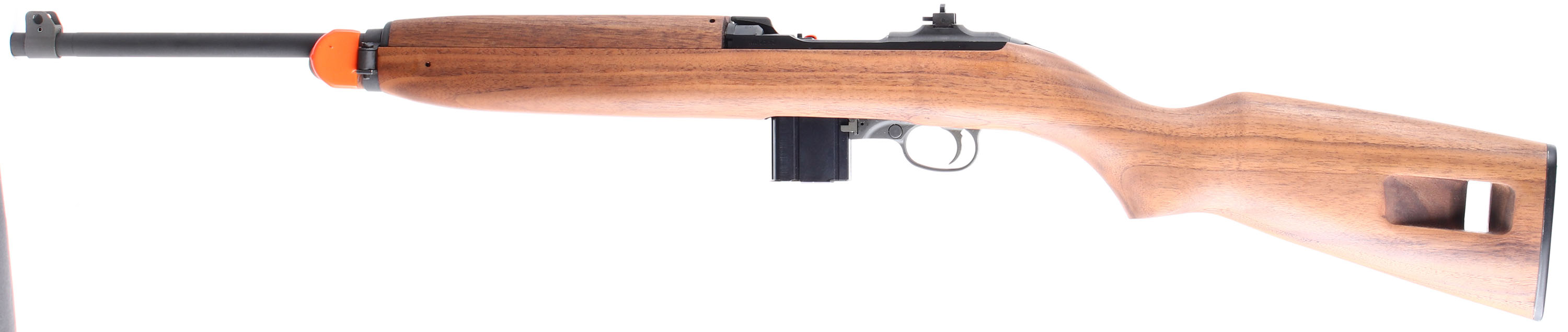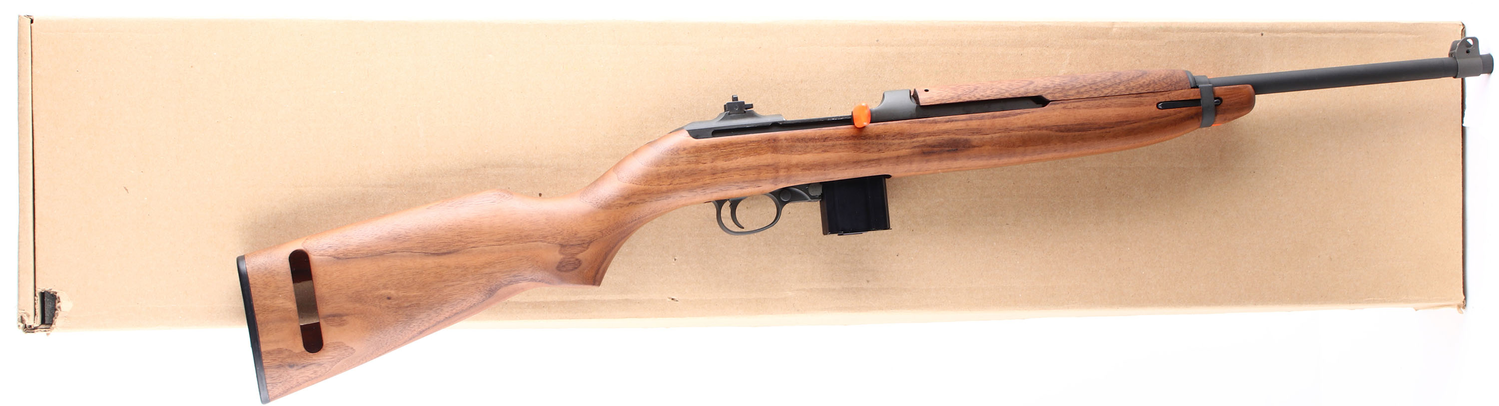 BOXED, Auto-Ordnance (Kahr Arms), Model: M1 Carbine, Cal: .30 Carbine, MFG: Modern S/N: MB2592, Semi-auto rifle, 18'' barrel. The semi-pistol grip American Walnut stock is Excellent near MINT with little to no visible wear. Black parkerized metal finish rates 99% overall with minimal wear from operation & firing. The receiver band is marked ''U.S. CARBINE'', ''CAL .30 ML''. The left side of the receiver is marked with the S/N. the rear of the receiver is marked ''AUTO-ORDNANCE'', ''WORCHESTER, MA.''. The bore is excellent. Bright & shiny with little no visible wear. The barrel holds a blade front sight with protective wings. The rear of the receiver holds L-leaf flip up aperture rear sight. The stock carries a steel buttplate with black paint finish. Rifle has the front, left side sling mount. Cutout in stock for oiler bottle to be used as rear sling mount, no oiler bottle in the stock. Rifle comes with the FACTORY box, gun lock, one 10 Rd. mag, owners manual & other associated paperwork. A beautiful modern production M1 carbine. FFL or C&R Req. - Value: 700 to 1400