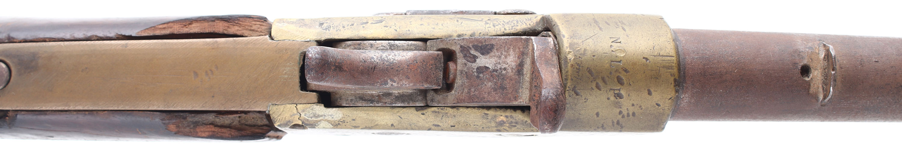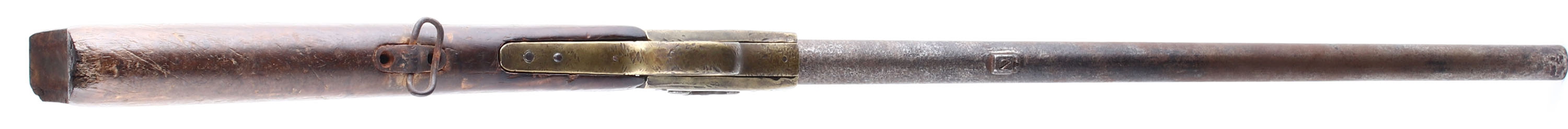 CONDITION: The straight wrist buttstock is fair to poor. Has cracks, chips, scratches, vice marks, dings, & wear from use/age. Missing forend. The barrel has toned to a mixture of gun metal gray & brown patina. the Brass frame has patina & numerus nick & ding marks. Crack in the rear top screw hole on the right side of the receiver along the top of the frame. Frame missing the forward receiver tang. Breech block is stuck forward, does have some play but wont mechanically open. Hammer is seized, does have some play but wont lock back. Forend/barrel lug is loose. The receiver band is marked ''N.L.P.''. The bore is Poor. Dark with pitting. The barrel holds a barleycorn front sight with a fixed U-notch rear. Buttstock has no buttplate. The rifle has a rear sling mount, loop is bent. This rifle is being sold AS IS with NO RETURNES ACCEPTED. Antique, No FFL Req - Value: 100 to 600