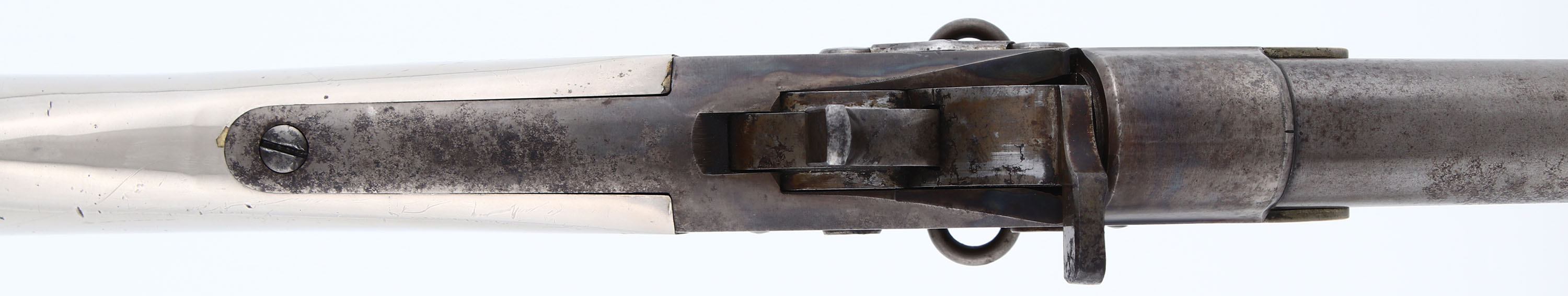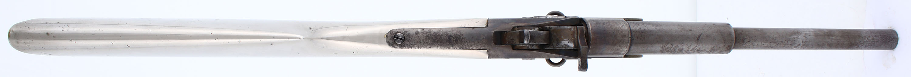 CONDITION: the straight wrist, nickel plated solid brass buttstock is very good, has some scratches & dings as well as some nickel flacking/chipping & pealing around the butt end corners & corners of the wrist. The buttstock retains about 96% of its nickel finish. The right side of the wrist is marked with the patent dates ''DEC.8.1885'', ''SEPT.7.1886''. The case-hardened finish on the receiver retains about 75% coverage with common wear spots thinned/toning to a brown patina. receiver has a light speckling of surface rust. The barrel is bare steel & has a rust/patina speckling. The left side of the receiver is marked ''REMINGTON ARMS CO. ILLION N.Y.''. The bore is very good. bright &* shiny with a couple spots of roughness. Rifle comes with two of the sleeve projectiles. Stock has no buttplate. A unique & rare collectors piece with a interesting use. Antique, No FFL Req - Value: 5000 to 10000