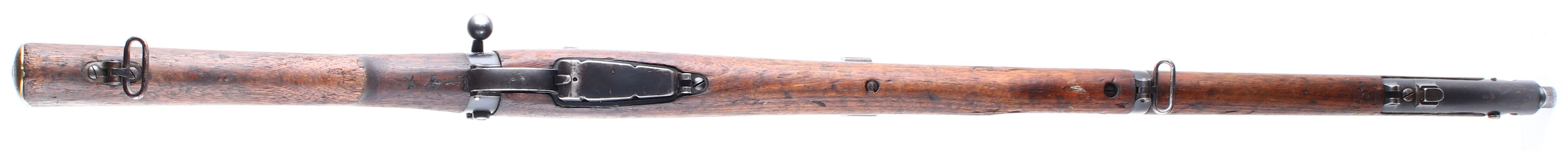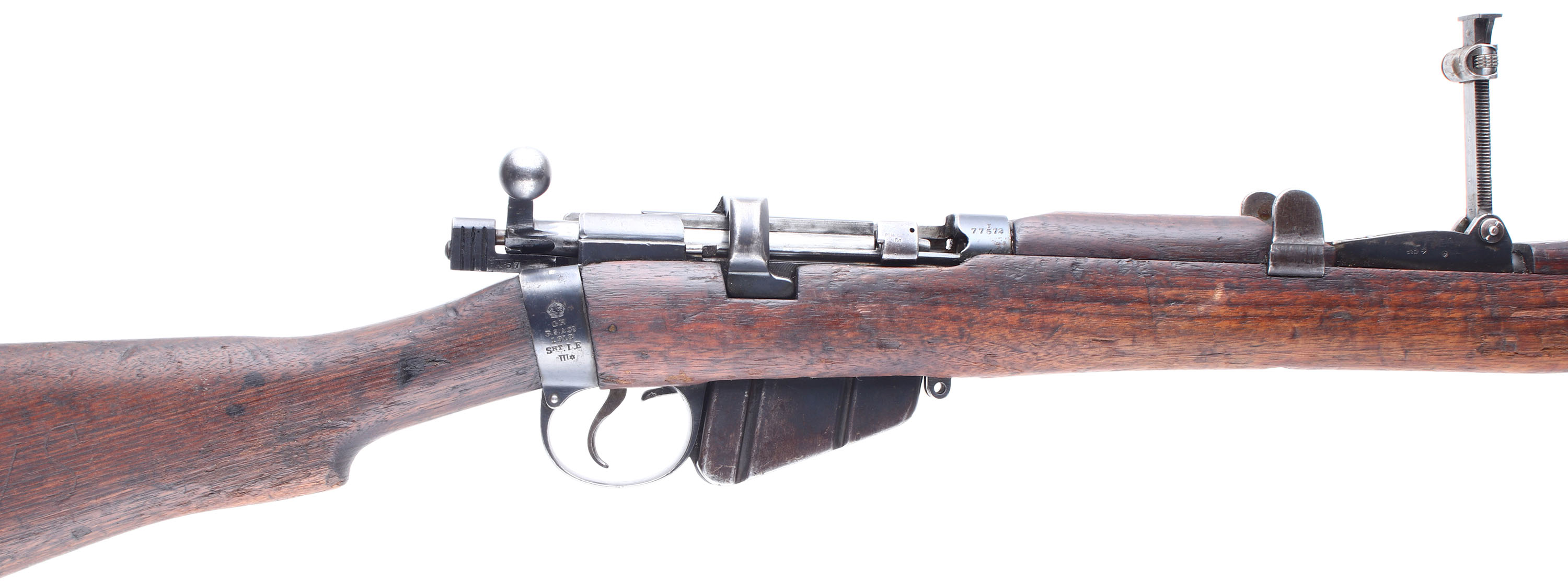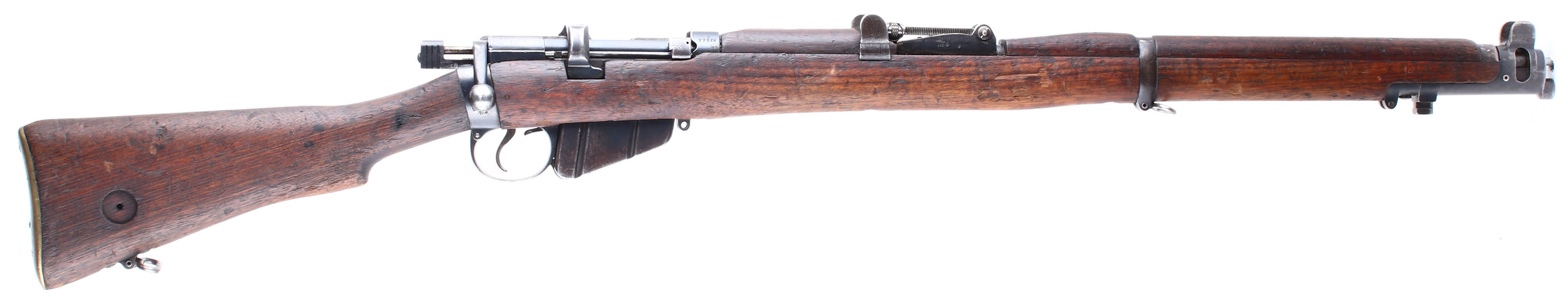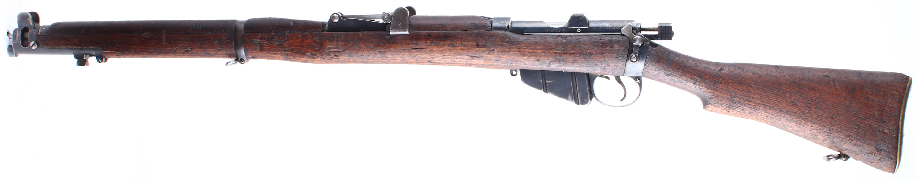 Birmington Small Arms Co. (B.S.A. Co. Limited), SHTLE III star (No.1 Mk.3 Star SMLE), Cal: .303 British, MFG: 1918, S/N: 77572 ( I serial block), Bolt action rifle, 25 1/4'' barrel. The two piece, semi-pistol grip wood stock is good with numerus nicks, dings, dents, & scratches from use/age. 3 missing chunk of the upper handguard, by the rear sight. This was a official English modification to the handguard done in the late 1950s when one ear or both ears around the rear sight were damaged (common as they were a weak point) & a replacement was not available due to shortages as they were phasing out the SMLE rifles. They would just trim the handguard back & then breaking was no longer a issue. The right cheek has a hole were a unit disc was, & is hand etched WS. Bottom of the wrist has a couple worn cartouches & stamped X. The bottom of the forend, just behind the bayonet lug is marked with a old crossed out S/N, & the S/N of the rifle. The metal carries a old arsenal re-finish with some lightly faded markings & a few dings under the finish. The blued metal finish rates 90% overall with spots of wear & thinning on the corners, around the safety on the receiver, & around the bayonet lug. Some areas of thinning toning brown. The rear of the receiver is marked with two proof stamps. Right side of the receiver band is marked with a crown over G.R., B.S.A.CO, 1918, SHT.L.E., III*. Left side of the receiver marked with import stampings, the receiver band is marked with proof stamps & the S/N. The chamber flats under the handguard have more proof stampings. Safety lever marked III. Other metal parts have small proof stamps. S/N mismatched bolt. More small proof marks on other metal parts. S/N mismatched bolt. S/N matching forend nose cap. The bore is good. Bright with strong rifling but has consistent roughness in the grooves. The barrel holds a square post front sight with protective ears, & a tangent U-notch marked 2 to 20. The stock carries a brass trapdoor buttplate that has dings & wear. Nothing inside trapdoor. The rifle both bottom sling loops. A Beautiful example of a WW1 Era Lee Enfield. FFL or C&R Req. - Value: 350 to 700