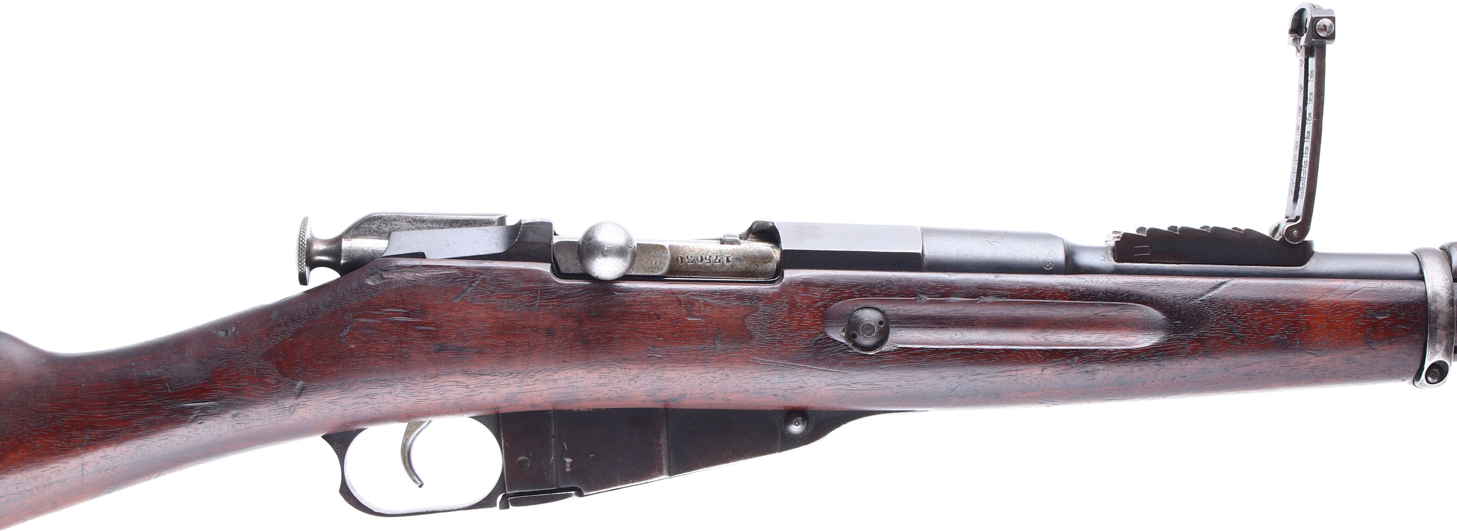 CONDITION: The straight wrist walnut stock is very good with various nicks, dings, dents, & scratches from use/age. One larger gouge on the right side of the toe. The metal sling well escutcheons are proud to the wood. The upper handguard has a 1'' crack at the rear, a 4 '' grain pop in the middle, & a 2 '' crack on the end. The rear & end of the upper handguard have more small chips & cracks. The metal has a arsenal re-finish & rates 87% overall with spots of wear/thinning & light speckled brown patina. markings are slightly faded from re-finish. The top of the receiver band is marked with a Russian imperial eagle over a Cyrillic ''P'', this means the rifle passed Russian inspection at Remington when it was made, not a indicator that it made it to Russia. The barrel shank is marked with another Russian imperial eagle over a Cyrillic ''P'', ''REMINGTON'', ''ARMORY'', ''1917'', ''NO'', the S/N, a ''0'' stamp just under the S/N, two small circle proofs, & five punch marks arranged like the five side of a die. The upper receiver tang is marked ''1'', ''C''. All parts are S/N mismatched; bolt is a mix of Tula & Izhevsk parts. The bore is good. Its bright but with thinned rifling & some roughness throughout the bore. The barrel holds a barleycorn front sight with a Konovalov V-notch rear sight. Sight markings are in ''Arshin'', a old Imperial Russian measurement. It equals to about 28 inches per Arshin. The stock carries a steel buttplate, starting to tone brown. Has both sling wells. Rifle has cleaning rod. FFL or C&R Req - Value: 400 to 800