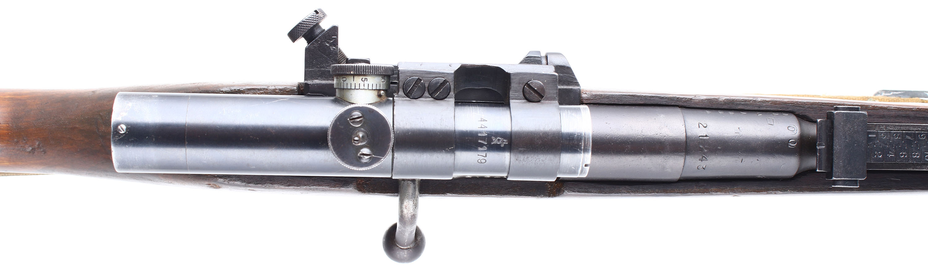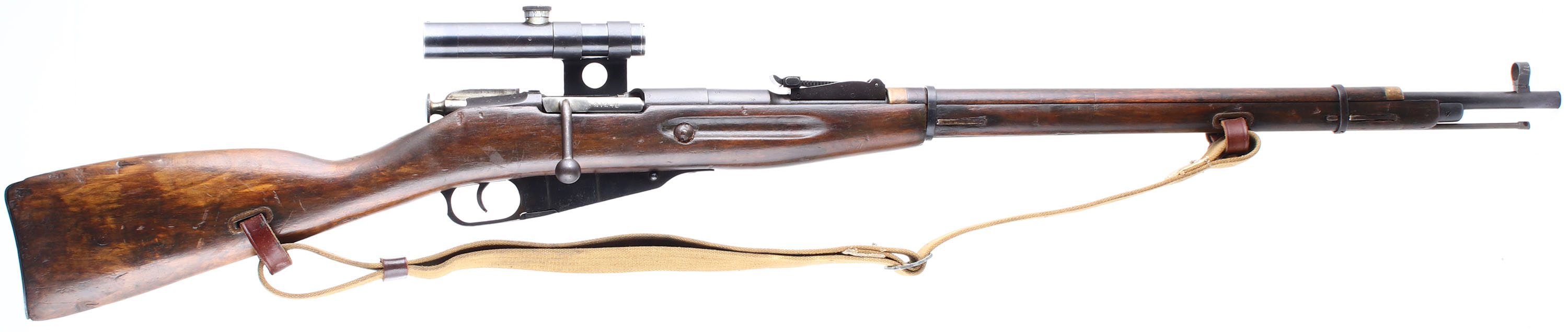 Izhevsk, M91/30 PU Mosin, Cal: 7.62x54mmR, MFG: 1944, S/N: 21243, Bolt action rifle, 29'' barrel. The straight wrist wood stock is good with various nicks, dings, dents, chips, & scratches from use/age. A stock lacquer has been added over the wood. Faint roundel cartouche on right cheek of stock. Metal parts in the stock like the recoil lug, forend cap, & sling well escutcheons have some rust & roughness. The metal carries a arsenal refinish & rates 90% overall with almost full coverage, just has spots of wear/thinning. metal has roughness/pitting scars under the finish & many markings have been worn/buffed away. The barrel shank is marked with the scope S/N ''44 1 4888'', a arsenal refurbishment diamond marking, the S/N and many faded proofs, the ''1944r'' marking is mostly gone with just the edges barely visible. The Izhevsk markings are gone off the barrel shank. The S/N appears to have been restamped as it would have been obliterated with the other markings. the underside of the receiver tang marked ''1944'' & with the Izhevsk arrow in triangle logo. No visible import markings. S/N matching bolt & buttplate, mismatched magazine floor plate. bolt body & its components marked ''02'' for Hungarian MFG at FEG in Budapest, indicating this might be a Hungarian rebuilt M91/30 PU. The bore is good to fair. It has strong rifling but with roughness throughout the bore & is beginning to darken. The barrel holds a post front sight with protective globe (loose in dovetail), U-notch leaf rear sight marked 1 to 20. The receiver has the Kochetov mount, PU scope rings, & PU scope mounted. PU scope rings are marked two faded Russian proofs. PU scope is a factory 237 NKV (Kazan) MFG & is number ''4417179'' (does not match rifle). They made PU scopes in 1943-44, & the majority were the SVT tube PU scopes, only a few thousand Mosin Tube PU scopes were made just before production ended in 1944. Total scope production for them would be less than 40,000. The stock carries a blued steel buttplate marked with the S/N on the upper extension. Roughness under the finish & light finish wear on edges. The stock has both sling wells & has a period correct Canvas sling with the leather ''dog collars''. Rifle also has a cleaning rod. A possible Hungarian Rebuilt PU Mosin that shows here honest wear & scars. FFL or C&R Req. - Value: 600 to 1400