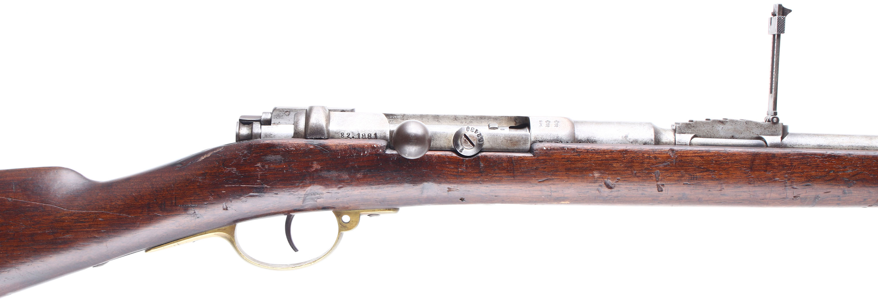 German/ French, I.G. Mod 71/95 Dovitis-Uruguay Mauser, Cal: 6.5x53.5mmSR Daudeteau. MFG: 1881, S/N: 92053, Bolt action single shot rifle. 31 1/2'' barrel.