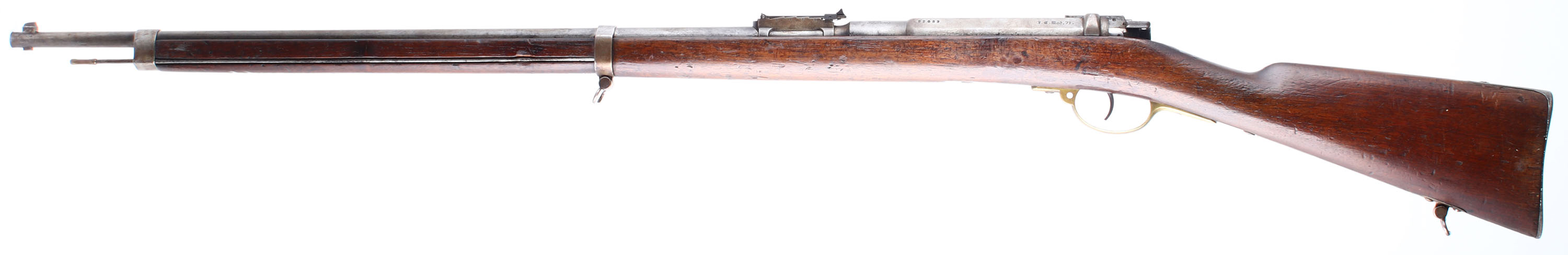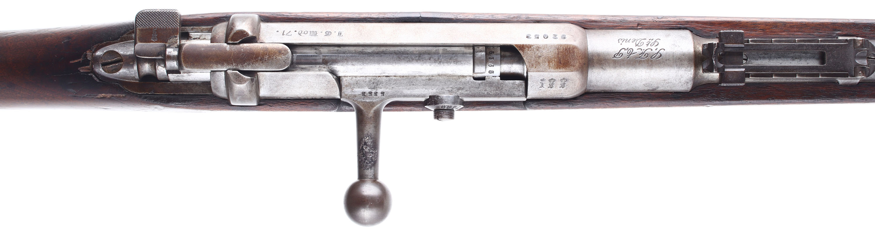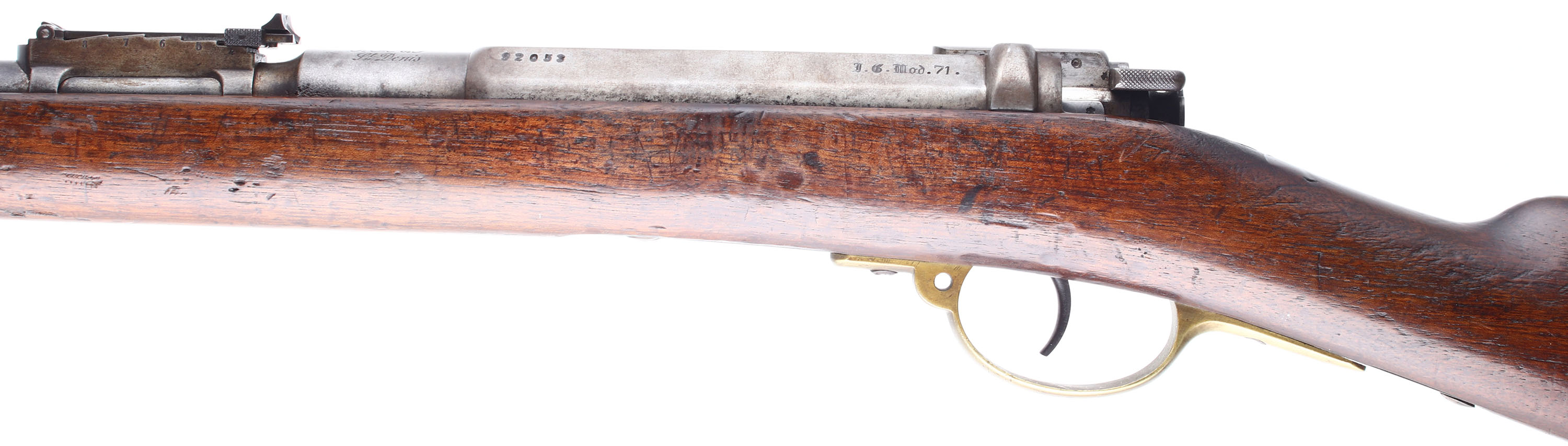 CONDITION: The straight wrist wood stock is good with numerus small nicks, dings, dents, & scratches from use/age. Two 1'' cracks on the top of wrist, emanating from the receiver tang, as well as some small chips. Two small end grain cracks at the toe, one on each side. The right cheek of the stock is handed etched ''B'', & stamped ''43'', ''15''. One small cartouche on the belly of the buttstock, just in front rear sling mount. bottom of the wrist marked with a faded ''F'' over a crown on top of a ''O''. the bottom of the forend, between the barrel bands, is stamped ''13''. The metal has toned to a gun metal gray with brown patina setting in. The receiver was left in the white (unfinished) from the factory. Spots of roughness/pitting around the stock line by the chamber & receiver. Brass trigger guard. The left side of the receiver is marked with the S/N, ''I.G.Mod.71.''. Right side of the receiver is marked with three Imperial German, crown over letter proofs, ''82.1881''. Dr. Dieter Storz mentions in his book ''German Military Rifles'', that the later date stamp is when it was issued to troops in German service. The top of the barrel is marked ''L.F.t.P'', ''St. Denis''. All parts S/N mismatched. The bolt body & striker body are S/N matching. The bore is excellent. Bright & shiny with little to no visible wear. The barrel holds a barleycorn front sight with a stepped base/ladder V-notch rear sight. Base marked 2 to 10, ladder marked 12 to 20. The stock carries a bare steel buttplate, has brown patina speckling. Rifle has bottom sling loop & forward sling ring. Rifle has brass tip cleaning rod. Antique, no FFL Req - Value: 600 to 1200