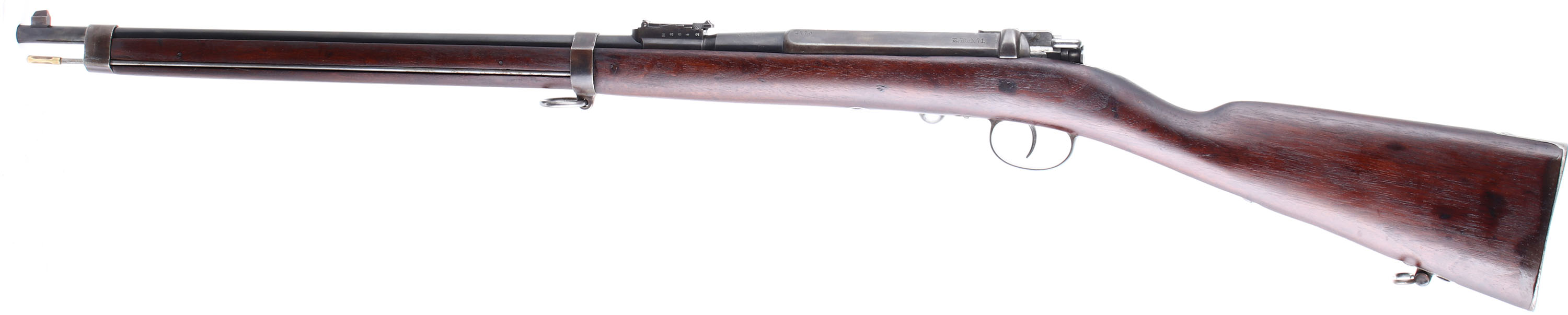 CONDITION: The straight wrist wood stock is very good as having a wrist break repair & being lightly sanded & refinish because of the break. The wrist repair is tight & has four wooden dowel reinforcement. One small chip repair on the stock/receiver bolt escutcheon, on the bottom of the stock. The stock also has a couple wood fill repairs dotted around the stock. The repairs & re-finish job is professional & appears to have been done in a arsenal, likely when it was converted at St. Denis. Light oil staining around buttplate. the bottom of the stock has two worn ''3'' stamps, one just in front of the trigger guard tang, one just behind. The blued metal finish on the barrel rates 94% with some spots of light thinning, mostly around chamber. The receiver was left in the white (unfinished) when it was made, but was blued at St. Denis when it was converted. The blued metal finish on the receiver rates 70% with thinning & spots toning to a brown patina. The left side of the receiver is marked with the S/N, ''K.Mod.71.''. Right side of the receiver is marked with three Imperial German, crown over letter proofs, ''1884''. The top of the barrel is marked ''L.F.t.P'', ''St. Denis''. S/N matching bolt, all other parts are mismatched. The bore is excellent. Bright & shiny with little to no visible wear. The barrel holds a barleycorn front sight with a stepped base/ladder V-notch rear sight. Base marked 2 to 10, ladder marked 12 to 20. The stock carries a bare steel buttplate, has brown patina speckling. Rifle has bottom sling loop & forward sling ring. Rifle has brass tip cleaning rod. A nice handy carbine with a unique story & mix of markings. Antique, no FFL Req. - Value: 800 to 1600