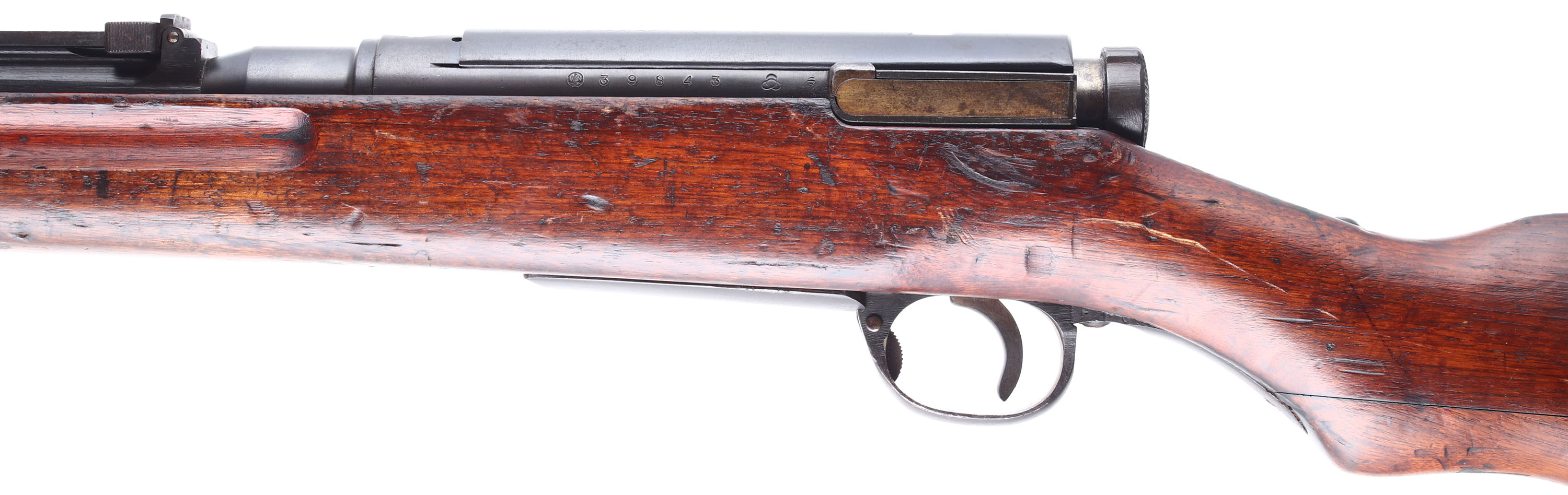 Kokura Arsenal (Japan), Model: Type 38, Cal: 6.5x50mmSR, MFG: 1935-38, S/N: 39843 (23rd series). Bolt action rifle, 31 1/2'' barrel. The semi-pistol grip wood stock is good with numerus nicks, dings, dents, & scratches from use/age. The right side of the stock, just above the trigger has a 1 crack emanating from the upper receiver tang. Next to the crack is a small wood fill repair. Another wood fill repair on the bottom of the stock, between the barrel bands. The two-piece buttstock is normal for Japanese rifles of this era, this was done to make the stocks stronger, easier to repair, & made better use of the wood to make the stock. Bottom of the wrist & the belly of the stock each have one Japanese cartouche. The metal carries a arsenal re-blue that rates 90% on the receiver & 95% on the barrel, with spots of thinned finish toning brown, speckled light rust, & spots of roughness/light pitting around the stock line. Grinding marks on the top of receiver where the Chrysanthemum was are toned brown. There is some roughness/cleaned pitting under the finish from the re-blue job. Some markings on the rifle are slightly faded from the re-blue job. The left side of the receiver is marked with the series mark, S/N, the Kokura Arsenal logo, & one small inspectors stamp. The top of the receiver is marked ''TYPE 38'' in Japanese, & has grinding marks where the Chrysanthemum was taken off. S/N matching bolt & dust cover. The bore is good. Its beginning to darken, with light roughness & thinned rifling. The barrel holds a barleycorn front sight with protective ears, & a flip up ladder, V-notch rear sight marked 4 to 24. The stock carries a steel buttplate, toned chocolate brown with roughness/pitting scars. Rifle has both bottom sling loops, missing the cleaning rod, & comes with a RARE original S/N matching dust cover. Rifle also comes with a Type 30 bayonet with sheath, made by National Denki under Kokura supervision, has hooked quillon. The vast majority of dust covers for the Arisaka's were ditched when they were surrendered as they would rattle if it wasn't fit to the rifle, the reason they have a S/N. There was no effort made to match the right bolts & dust covers to the right rifles when they were taken as souvenirs, so they were tossed. Almost every Arisaka left the factory with a dust cover during the pre, early, & mid war times, this was abandoned on the later last ditch rifles. Rifle appears to mechanically function fine. FFL or C&R Req - Value: 300 to 600