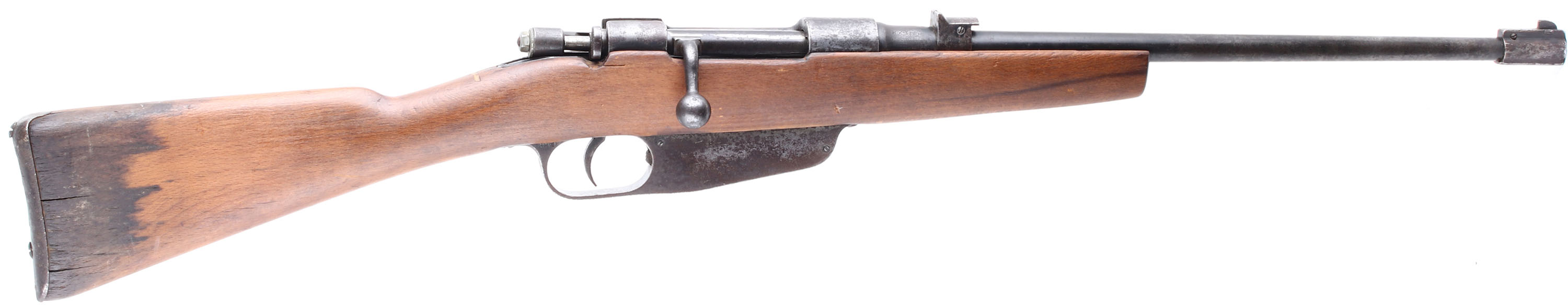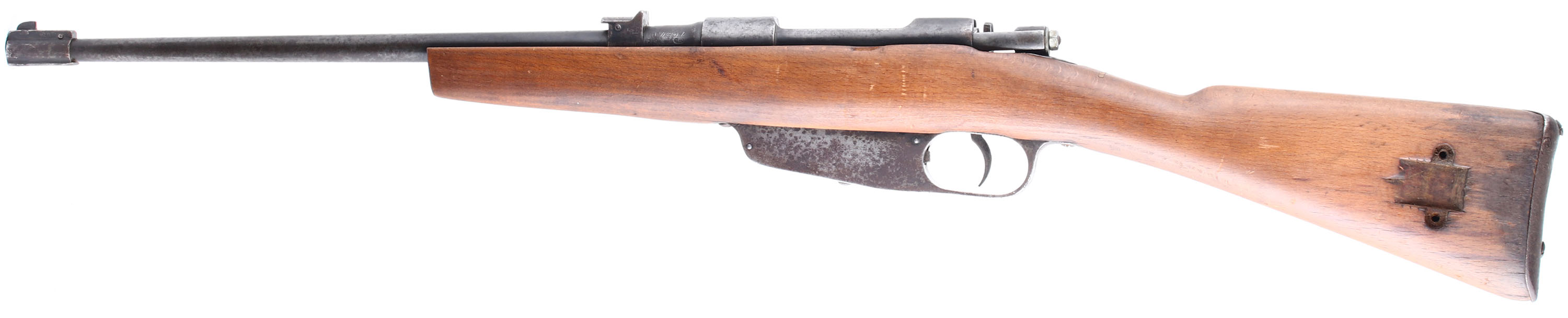 CONDITION: The original straight wrist beech wood stock is good as being cut down, sanded & oiled. Oil stains & grain pops on the buttstock around the buttplate. There are a couple small cracks around the magazine/trigger guard & upper tang. The top of the wrist has a resin filled crack repair. Bottom of forend still has channel for the folding bayonet. The metal is a mix of original blue in protected areas, gun metal gray & brown patina with a speckling of roughness throughout. Markings are slightly faded from rust/wear. The rear of the barrel is marked with the S/N, two small proofs, ''GARDONE VI'', ''1941-XIX''. The rear sight block has two small proofs on the left side & the top is marked ''CAL 6.5''. Left side of the front sight base is marked ''C.A.P.''. The firing pin/striker cap is missing & has been replaced with a modern nut & washer. The bore is very good. Its bright with strong rifling & only has some light roughness. The barrel holds a blade front sight with a fixed V-notch rear sight. The stock carries a steel trapdoor buttplate. Buttplate has roughness & pitting, trapdoor is stuck shut. Rifle is missing both sling mounts. Rifle appears to mechanically function fine. A handy little carbine that would make a great utilitarian shooter. FFL or C&R Req. - Value: 100 to 150