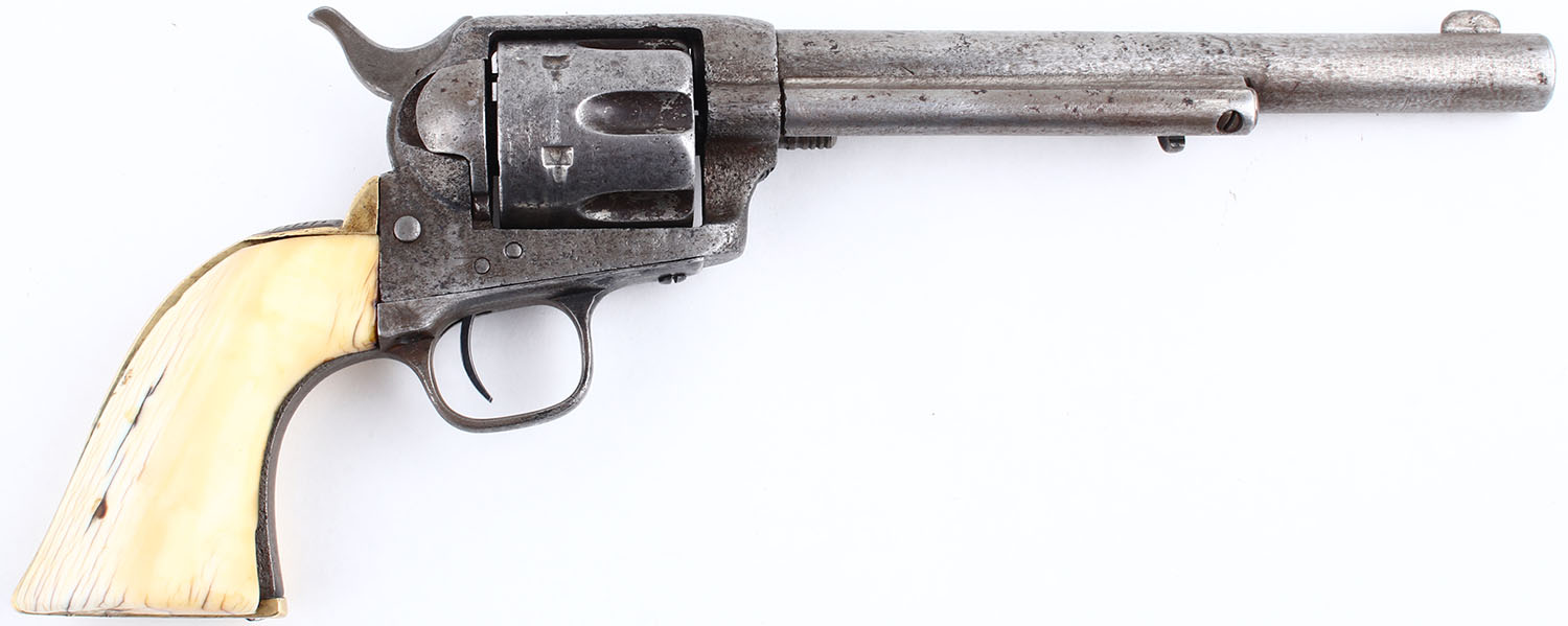 CONDITION: The authentic ivory grips are very good & solid. The grain pattern & difference in tones are appealing. There are some minor edge chips. The original nickel finish has fully worn to gun metal gray, with remnants of original nickel finish remaining on the cylinder, in protected areas. The bottom of the barrel, just in front of the cylinder pin is marked ''44'', no other visible barrel markings. The patent stampings on the left side of the frame is worn but still partially visible. There is spotting & pitting throughout the metal surfaces & a barrel ring 2 3/4'' from the muzzle. The bore is poor, dark & worn. Integral v-notch rear sight & blade front sight. Mechanical operation appears to function properly, but the action has play & the components appear to be worn from use. The normal four cylinder clicks are reduced to two. This revolver is accompanied by an 1880's beaded belt, with white, red, yellow & blue beads. The belt holds a beaded holster, beaded pouch, painted knife sheath & a small metal badge marked ''DEPT OF PUBLIC SAFETY TEXAS RANGERS'' with a Texas Star in the middle. The beaded holster has a Texas Star with arrows, ''5'' & a snake?. The knife sheath holds a 6'' blade, with bone handle. Blade condition is fair. A unique set, with accoutrements. The frontier Six shooter came out in 1877 in .44-40 rather than .45 Colt. This was done to have ammo interchangeability with the popular 1873 Winchester to boost sales. This pistol has a black powder frame which uses a set screw to lock the cylinder pin & not a push button. It was introduced in 1892, but was not fully implemented until 1896 with old frames & parts being used up. Antique, No FFL Req - Value: 2500 to 4500
