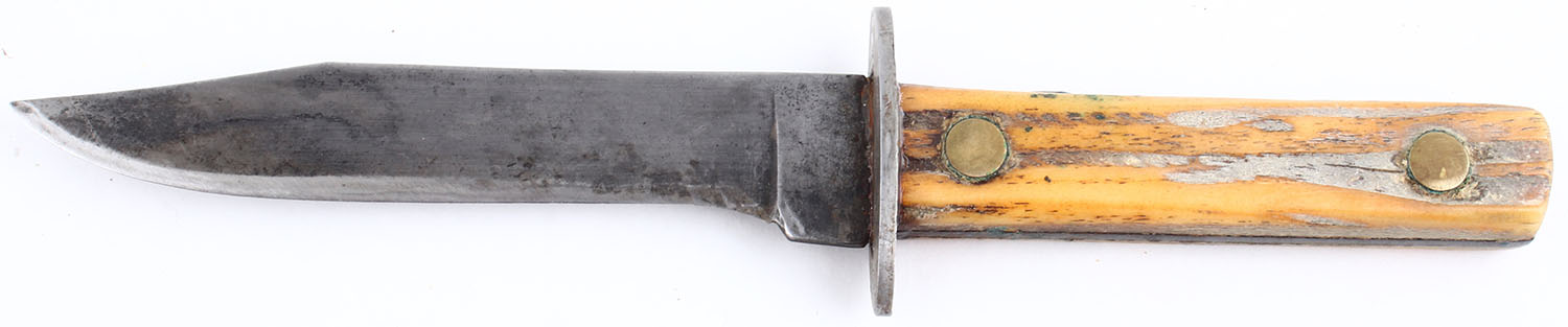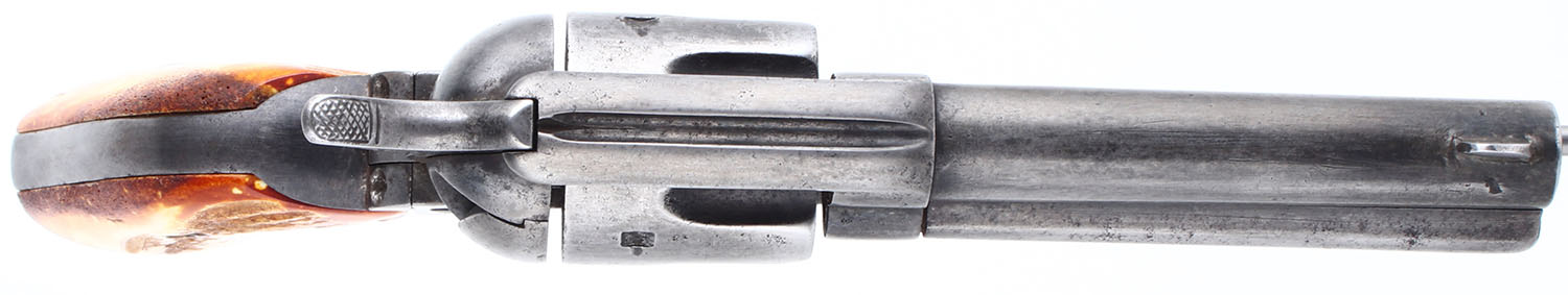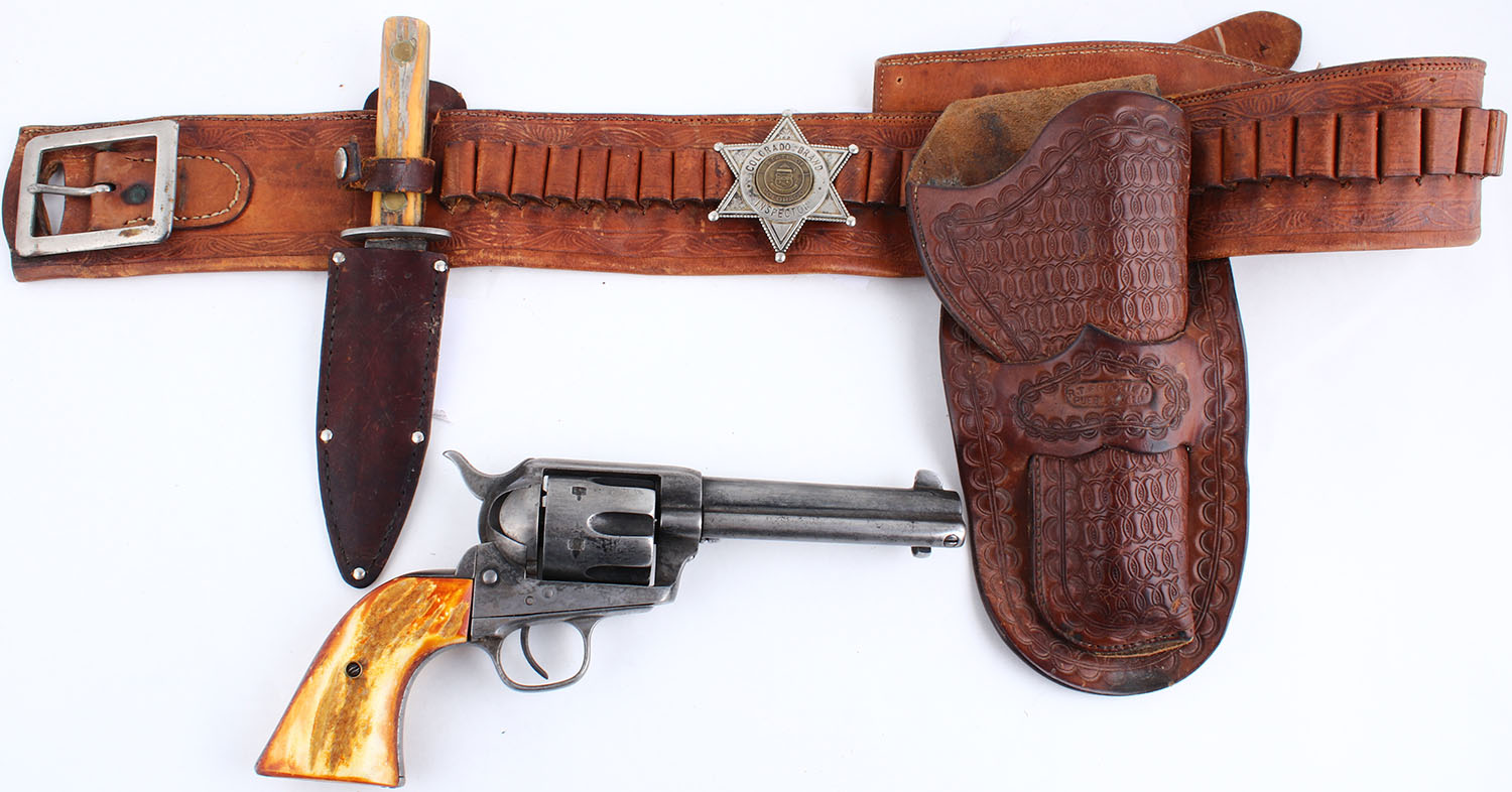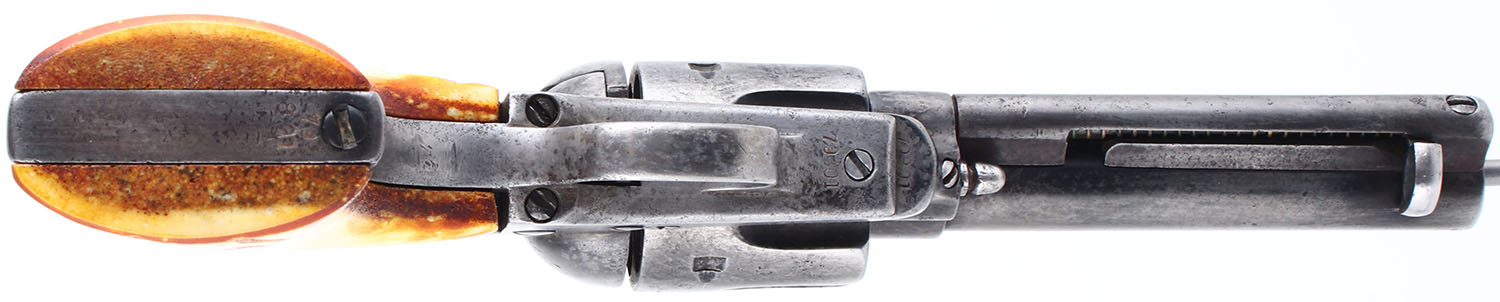 UNIQUE SET, Colt, 1873 Single Action Army, CAL: 44/40, MFG: 1882, SN: 79801, Single Actin Revolver, 4 3/4'' barrel. The barrel markings have been buffed smooth. The three line patent date on the left side of the frame is worn, but legible. All matching SN on the frame, trigger guard & butt. The authentic bone grips are excellent. They appear to have a stain or lacquer. The blued finish on the barrel & trigger guard has fully worn to metal gray & the case-hardened finish on the frame has full worn to metal gray, with shadowing remaining. Bore is fair, with consistent roughness & pitting. Integral v-notch rear sight & blade front sight. This revolver is accompanied by a 1886 A.M Nash Money Belt, marked ''AM NASH SADDLERY TRINIDAD, COLORADO''. The belt holds a 1898 R.T Frazier tooled single loop holster, marked ''R.T. FRAZIER PUEBLO, CO''. Additionally, the belt holds an unmarked knife sheath carrying a an unmarked blade with bone handle & a U.P Railroad Police Badge, marked ''COLORADO BRAND INSPECTOR''. Blade condition is very good, with some discoloration. A unique set, with accoutrements. Antique, No FFL Req. - Value: 2500 to 4500