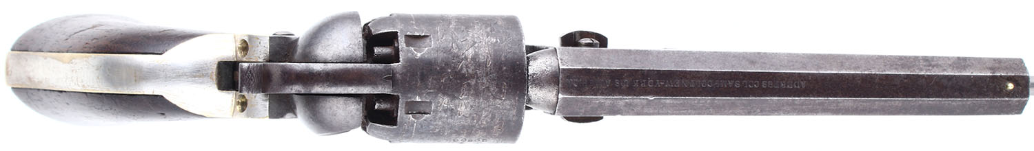 Colt, 1849 Pocket, CAL: 31 Black Powder, MFG: 1862, SN: 220806, Single Action Revolver. 5 barrel. The wood grips are in good condition, solid with some dings and scratches, most notably two gashes on the bottom of the left grip panel. The finish on the barrel has worn and toned to a thin brown patina with some splotches of gun metal grey. The frame has some shadows of case-hardening. The nickel finish on the brass grip frame rates 88%. The top barrel flat is marked ''ADDRESS CCL SAM L COLT NEW YORK CITY US AMERICA'', the left side of the frame is marked ''COLTS PATENT''. Has matching serial numbers on the: grip frame, frame, barrel, cylinder, and barrel wedge. The cylinder has worn markings that are visible but not very defined. Bore is fair, very dark with fairly even roughness and a couple splotches of pitting but defined lands and groves. Mechanically solid with some side to side and back and forth play in the cylinder, hammer and trigger mechanism seems solid. The rear sight notch is cut into the hammer, front bead sight on the barrel near the muzzle. Antique, No FFL Req. - Value: 600 to 1200