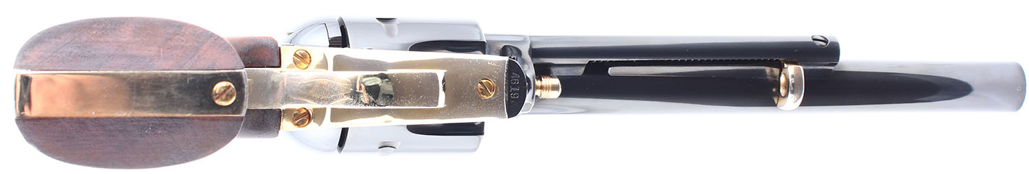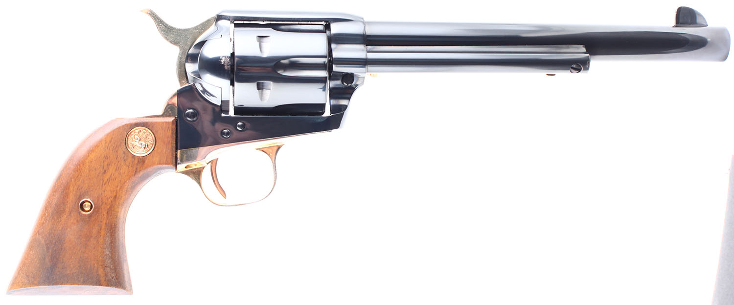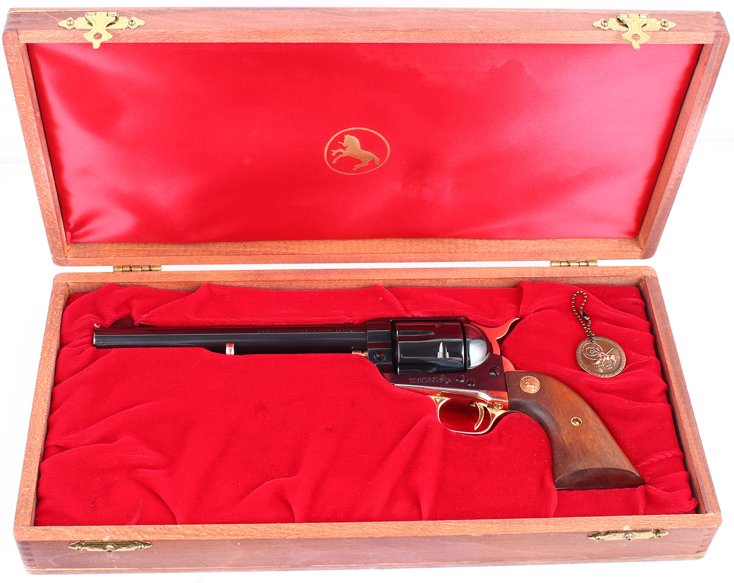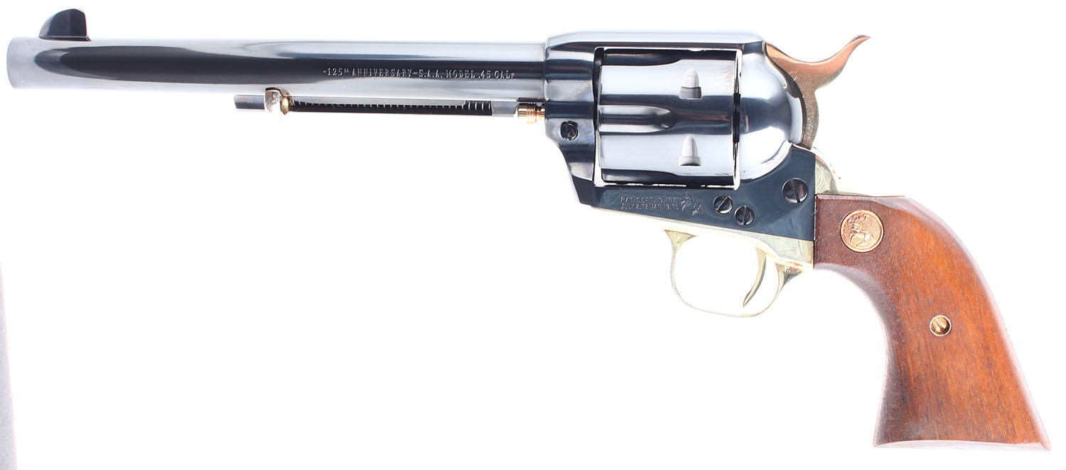 CASED Colt, Single Action Army, CAL: 45 Colt, MFG: 1961, SN: 4619AM, Single Action Revolver. 7 1/2'' barrel. The Colt medallion wood grips are in excellent condition. The blued finish rates 98% with some rust in less visible areas such as under the hammer and behind the cylinder. There are some splotches that have worn down and toned to a mix of gun metal grey and brown patina, most notably on the loading gate and at the end of the ejector housing. The brass frame is in excellent condition. The side of the barrel is marked -125th ANNIVERSARY - S.A.A. MODEL .45 CAL. -. Bore is excellent. Mechanically very solid, the cylinder has very little side to side and back and forth play. Front blade sight is integral to the barrel, rear sight trough is cut into the top of the frame. Comes in a red felt lined wooden case with a 125th anniversary commemorative medallion. FFL or C&R Req. - Value: 1200 to 2400