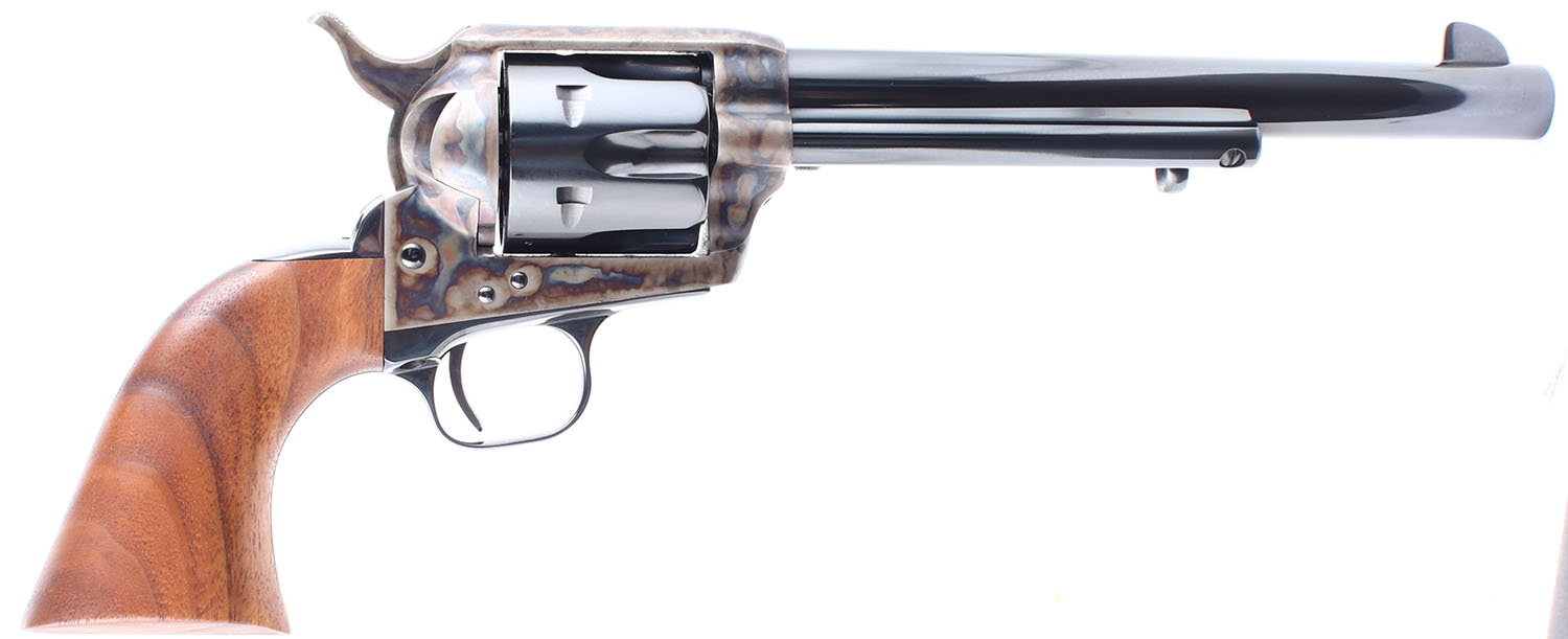CASED Colt, 1873 Peacemaker Centennial, CAL: 45 Colt, MFG: 1973, SN: PC572, Single Action Revolver. 7 1/2'' barrel. The wood grips have SLC (Samuel L. Colt) engraved on the bottom of the left hand panel and are in excellent condition. The blued finish on the barrel, cylinder, grip frame, and trigger rates 99%. The case hardened frame and hammer are in excellent condition. The side of the barrel is marked 1873 PEACEMAKER CENTENNIAL 1973. Bore is excellent. Mechanically very solid, the cylinder has very little side to side and back and forth play. Front blade sight is integral to the barrel, rear sight trough is cut into the top of the frame. Comes in a purple felt lined wooden display case with commemorative metal placard. FFL or C&R Req. - Value: 1500 to 3000