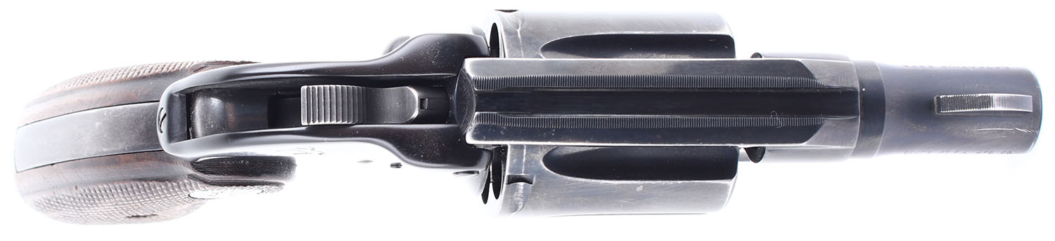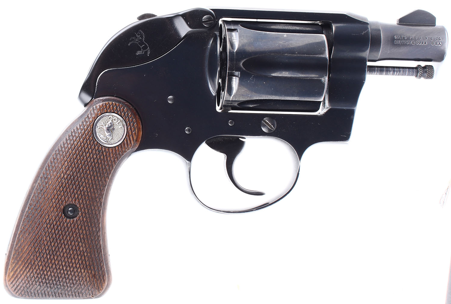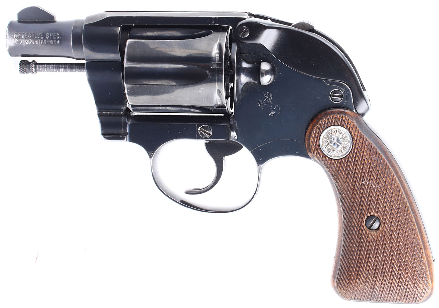 Colt, Detective Special: Post War, Second Issue, CAL: 38 SPL, MFG: 1964-68, SN: 960336, Double Action Revolver. 2'' barrel. The checkered wood grips with colt medallion are in very good condition with some handling wear and a small chip on the bottom of the right grip panel. The blued finish rates 94% with light handling wear, most notably the backstrap has worn down and toned to a mix gun metal grey, brown patina, and original bluing, there is also a ding on the end of the barrel near the muzzle. Bore is very good, the rifling is thin but bright. Mechanically poor, the cylinder and trigger mechanism seem to be out of time and will require professional gunsmithing to function properly. Blacked out sights, front sight is integral to the barrel, rear sight is cut into the frame. SOLD AS IS, NO RETURNS. FFL or C&R Req. - Value: 300 to 600