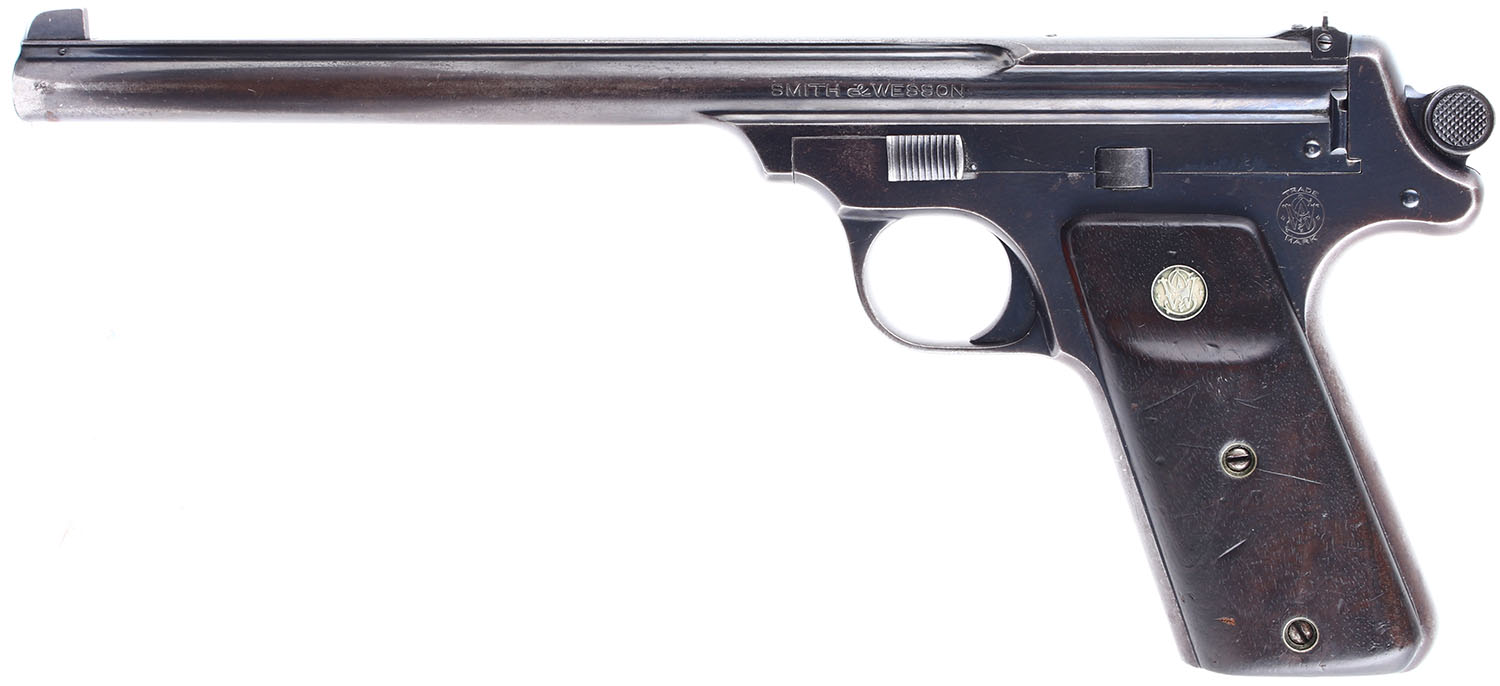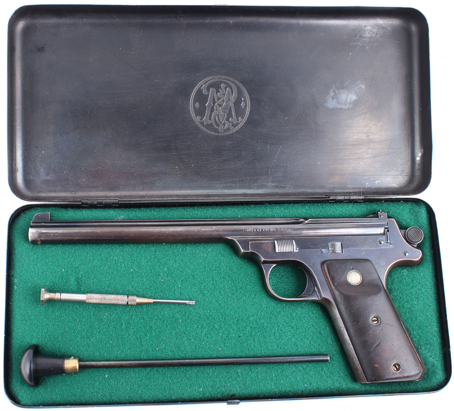 CASED Smith & Wesson, Straight Line Target, CAL: 22LR, MFG: 1925-36 SN: 390, Single Shot. 10'' barrel. The wood grips are in very good condition with light handling wear, there seems to be a thick matte finish on them that has darkened substantially. The blued finish rates 50% with substantial handling wear and patina. Bore is excellent. Mechanically solid. Rudimentary sights, front blade sight is pinned to the barrel, rear sight is set in a cut on the barrel. Comes in a green fabric lined metal case with a cleaning rod and a screwdriver. FFL or C&R Req. - Value: 800 to 1600