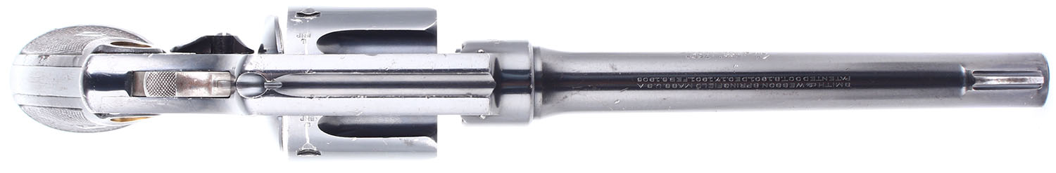 CONDITION: The checkered wood grips with S&W medallion are very good with some handling wear & small contusions. The bottom of the right grip panel is stamped RYL. ENGRS.. The blued finish rates 97% with some handling wear & patina. The case hardening on the trigger and hammer is excellent. Bore is excellent, slightly thinned but very bright rifling with little to no roughness. Mechanically solid, the cylinder has little side to side & back & forth play, the hammer & trigger mechanism functions well. Rudimentary sights, front blade sight is integral to the barrel, rear sight trough is cut into the frame. FFL or C&R Req - Value: 500 to 1000