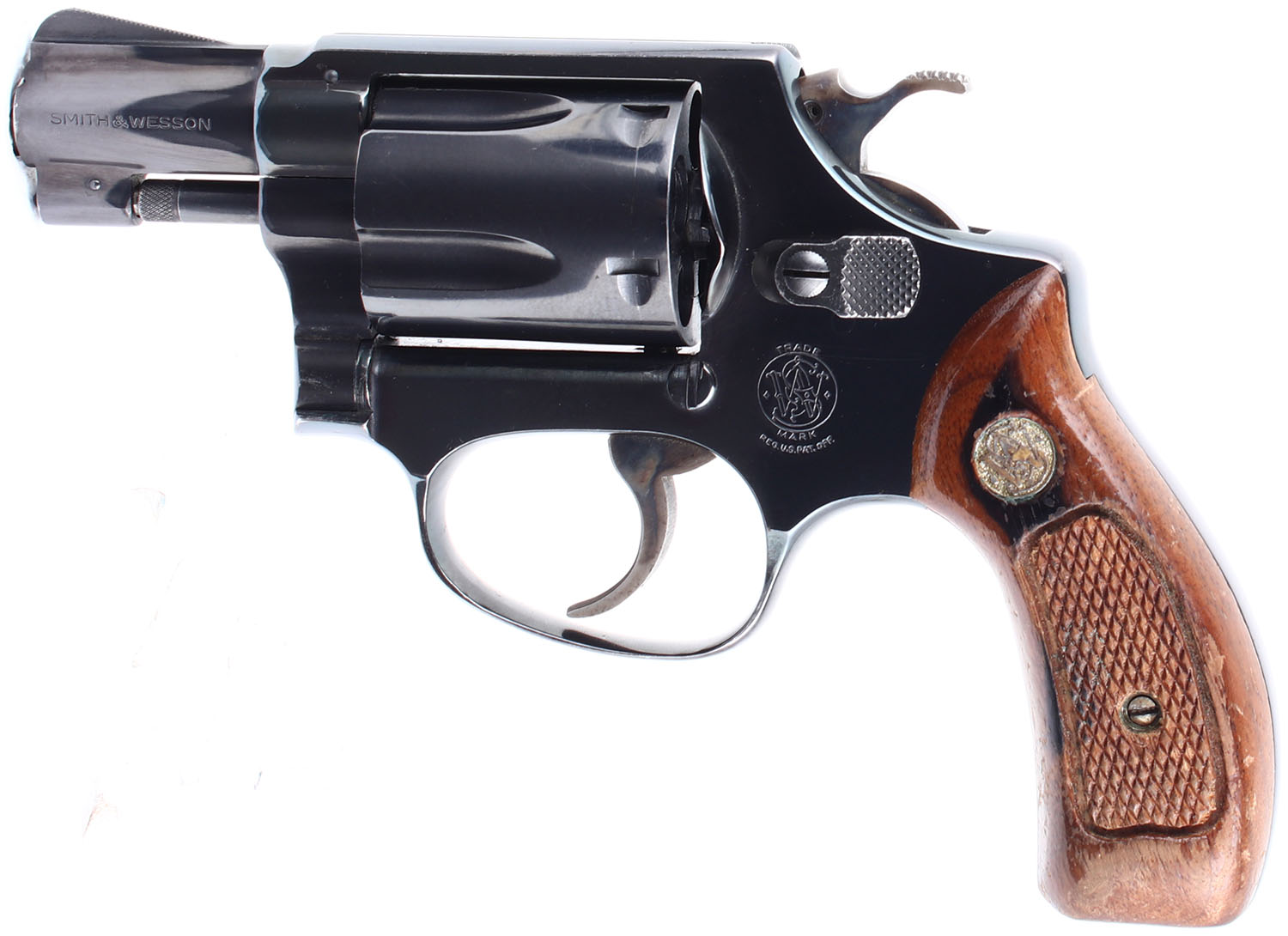 Smith & Wesson, Model 36, CAL: 38 SPL. MFG: Modern. SN: 7J848, Double Action Revolver. 1 7/8'' barrel. The checkered wood grips with S&W medallion are in good condition with some handling wear and dings, the right grip panel is chipped near the top where it meets the frame. Part of the grips have been stained black by the retention strap of the leather holster. The factory blued finish rates 99% with very light handling wear. The case hardening on the trigger and hammer is excellent. Bore is excellent. Mechanically solid, the cylinder has very little side to side & back & forth play, the hammer & trigger mechanism functions very well. Rudimentary sights, serrated front ramp sight is integral to the barrel, rear sight trough is cut into the frame. Comes in a generic black leather holster. FFL Req. - Value: 400 to 800