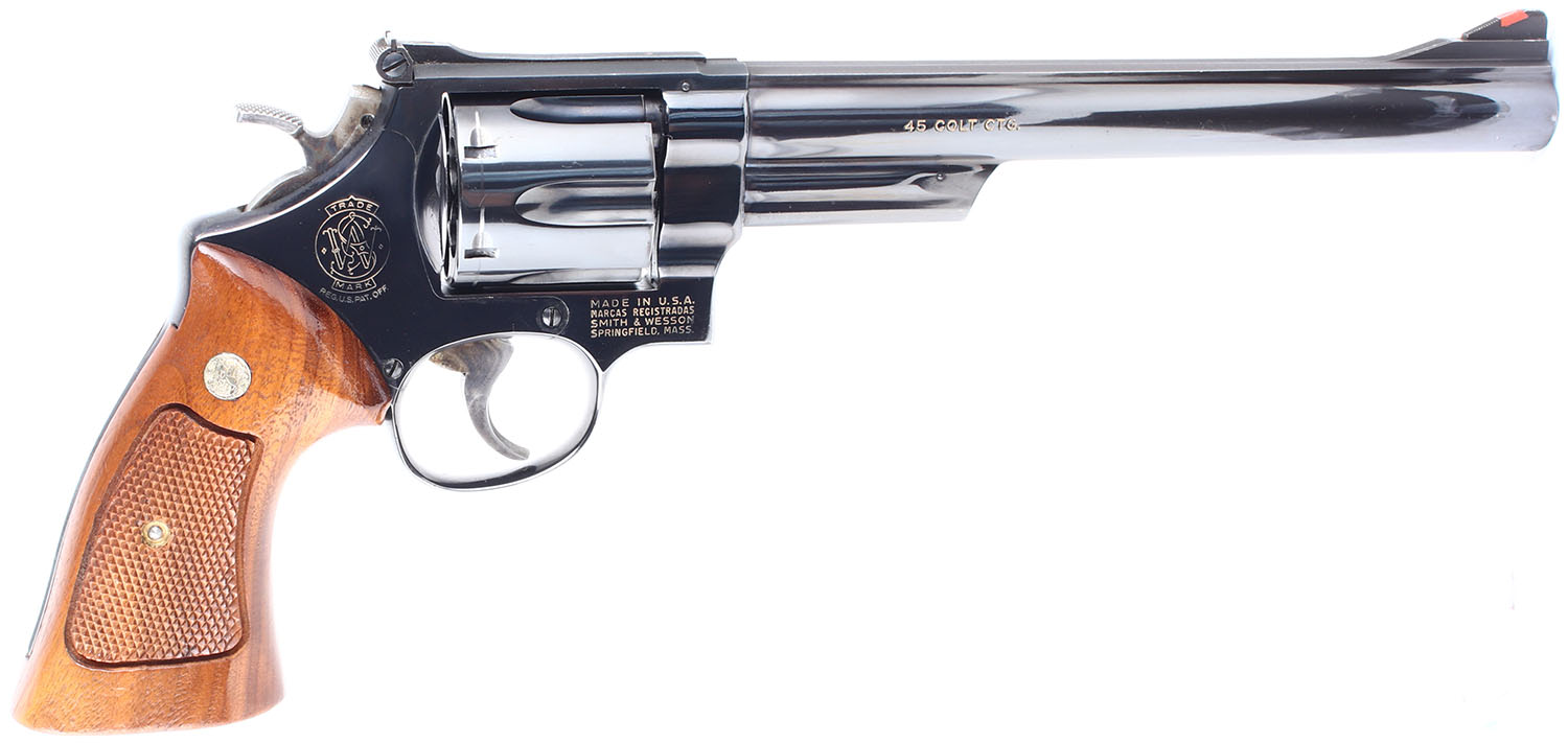 Smith & Wesson, 25-2, CAL: 45 Colt. MFG: 1980-83. SN: N822411, Double Action Revolver. 8 1/4'' barrel. The factory checkered wood grips are in excellent condition with light handling wear. The factory bluing rates 97% with light handling wear. The case hardening on the hammer and trigger is excellent. Bore is excellent. Mechanically solid, the cylinder has some side to side & back & forth play. Contrast revolver sights, serrated front ramp sight with a red plastic insert set in a dovetail cut is integral to the barrel, windage and elevation adjustable rear sight with white U notch is screwed to the top of the frame. FFL Req. - Value: 1000 to 2000