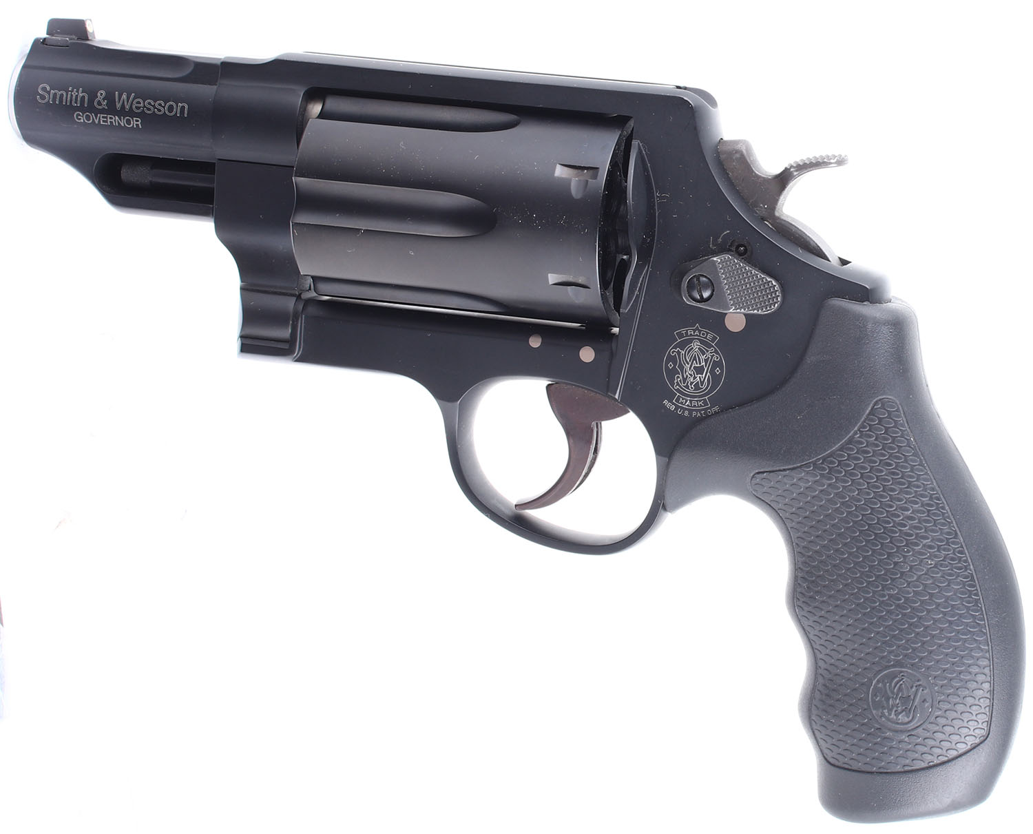 BOXED Smith & Wesson, Governor, CAL: 410GA/45Colt/45ACP. MFG: Modern. SN: CUF2789, Double Action Revolver. 2 3/4'' barrel. The factory rubber grips are in very good condition with some handling wear. The factory black finish is excellent with light handling wear. Bore is excellent. Mechanically solid, the cylinder has some side to side & back & forth play. Front white dot sight (possibly a night sight at some point, does not glow any more) is set into a dovetail cut on the barrel, rear trough sight is cut into the frame. Comes in the SN matched Smith &Wesson cardboard box, with a set of frame lock keys, moon clips (For 45ACP), an owners manual & other related paperwork. FFL Req. - Value: 500 to 800