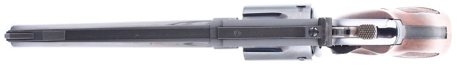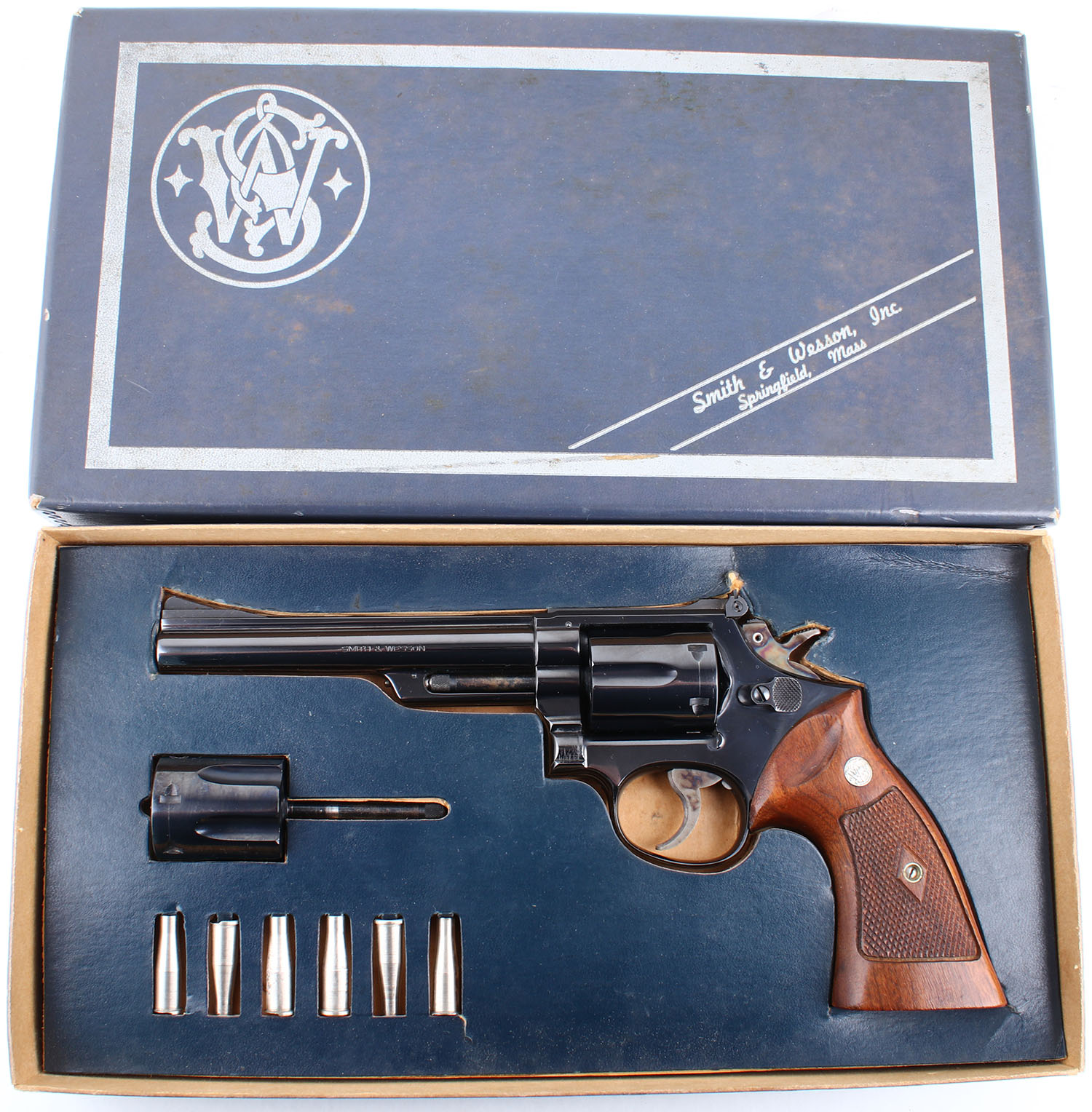 BOXED Smith & Wesson, Model 53, CAL: 22 JET/22LR. MFG: 1961. SN: K462168, Double Action Revolver. 5 7/8 barrel. The factory checkered wood grips with S&W medallions are in excellent condition with very light handling wear. The factory blued finish rates 98% with very light handling wear and a small ding on the right side of the barrel. Bore is excellent. Mechanically solid, the cylinder has very little side to side & back & forth play. Blacked out target sights, serrated front ramp sight is integral to the barrel, windage and elevation adjustable rear sight is screwed to the top of the frame. Comes in a Smith and Wesson model 53 cardboard box (Not serially matching) with a full set of 22 LR sleeves for the 22 JET cylinder and a dedicated 22 LR cylinder. FFL or C&R Req. - Value: 1000 to 2000