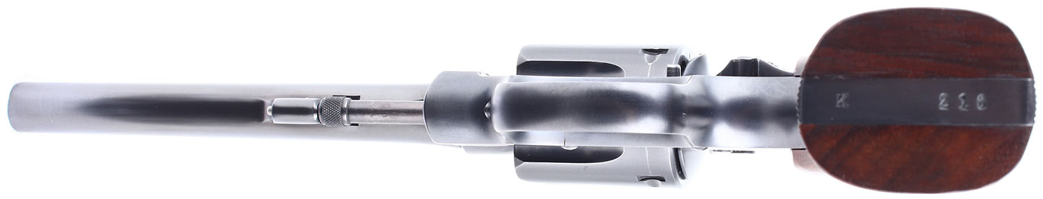 CONDITION: The factory checkered wood grips with S&W medallions are in excellent condition. The factory blued finish rates 99% with very light wear. The case hardening on the hammer and trigger is excellent with the trigger being slightly faded but the hammer being vibrant and crisp. Bore is excellent. Mechanically very solid, the cylinder has very little side to side & back & forth play. Blacked out target sights, serrated front ramp sight is integral to the barrel, windage and elevation adjustable rear sight is screwed to the top of the frame.