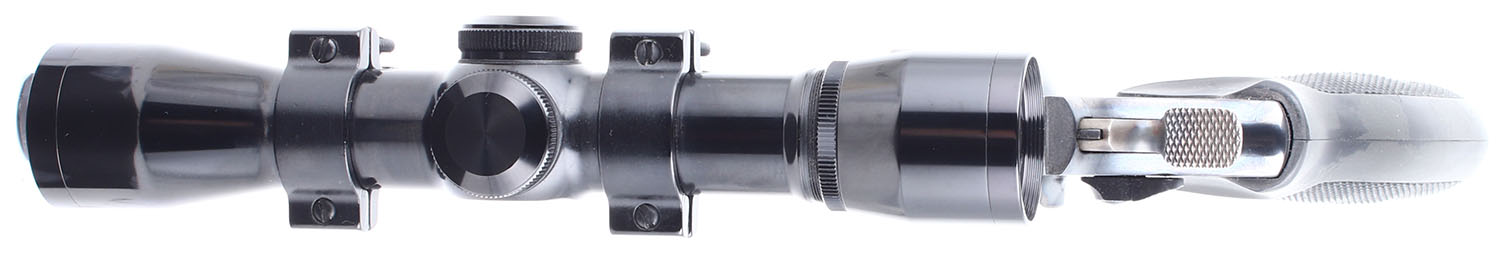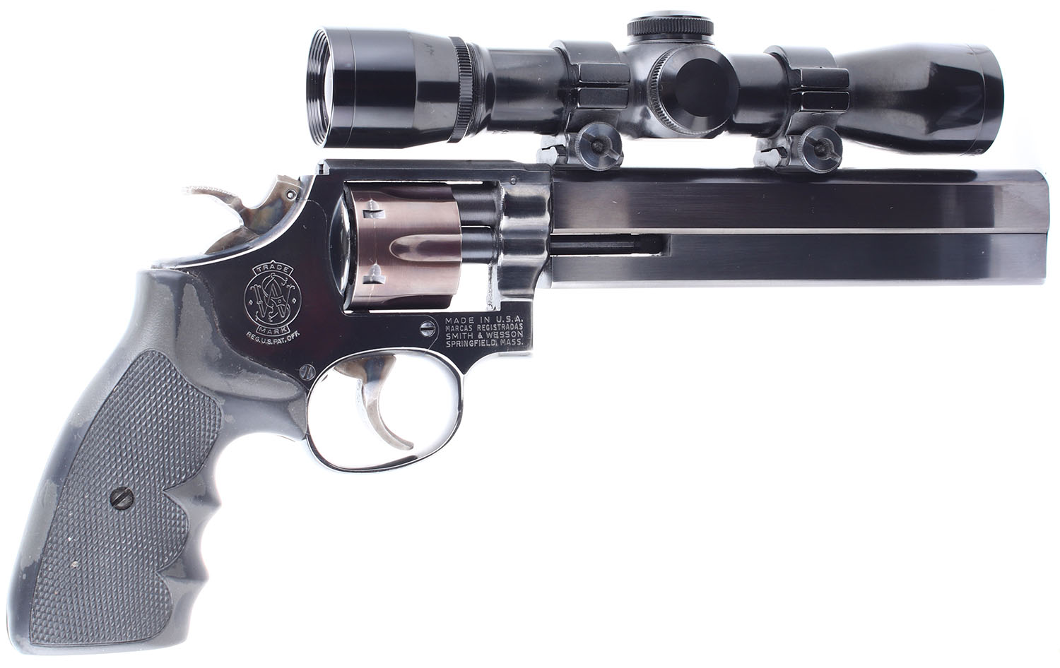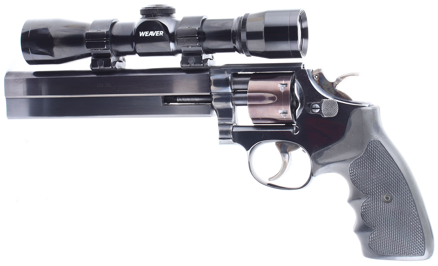 Smith & Wesson, Custom Target Model 14-4, CAL: 38 S&W. MFG: 1981. SN: 97K3469, Double Action Revolver. 7 1/2 barrel. The checkered rubber grips are in very good condition, they are solid but have substantial handling wear. The bluing rates 99% with very light wear, the bluing on the cylinder has toned to an even plumb patina, the case hardening on the hammer and trigger is very good with some handling wear. Bore is excellent. Mechanically very solid, the cylinder has some side to side & back & forth play. This gun has been rechambered in 38 S&W, it has a bull barrel, and Weaver pistol scope mounted to it. FFL Req. - Value: 500 to 1000