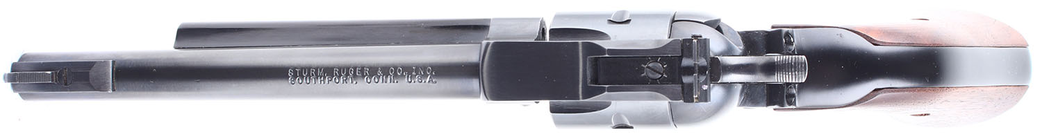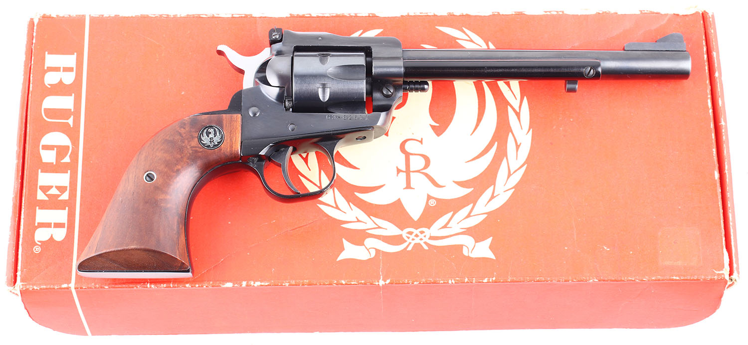 BOXED Ruger, New Model Single Six, CAL: 22 LR. MFG: 1975. SN: 63-82611, Single Action Revolver. 6 1/2 barrel. The factory wood grips with Ruger medallions are in excellent condition. The bluing rates 99%. Bore is excellent. Mechanically good, the cylinder has very little side to side & back & forth play. The hammer and trigger mechanism is slightly stiff and will occasionally get stuck in the forward position, after cycling it a few times with a bit of oil in the mechanism it loosened up substantially. The mechanical function will likely improve drastically if the gun is cleaned thoroughly. Blacked out target sights, the rear windage and elevation adjustable sight is pinned in a cut on the frame, the serrated front sight is screwed to the barrel. Comes in a factory Ruger cardboard box with an owners manual. FFL or C&R Req. - Value: 400 to 800