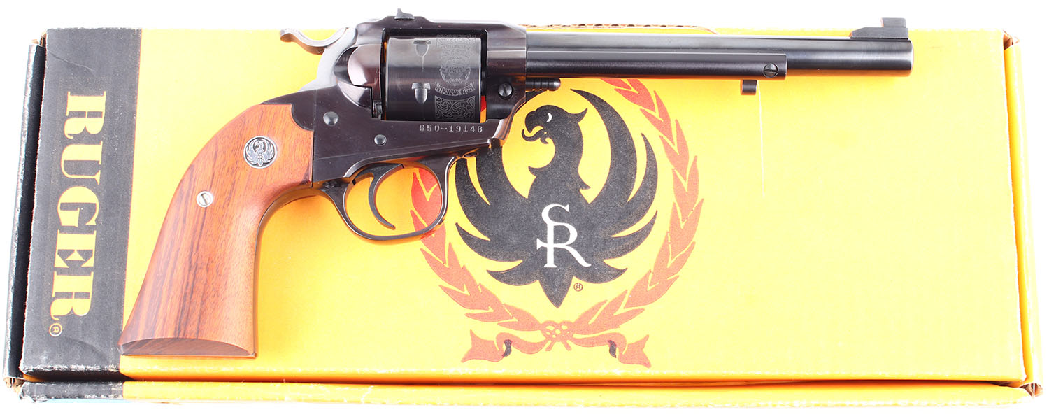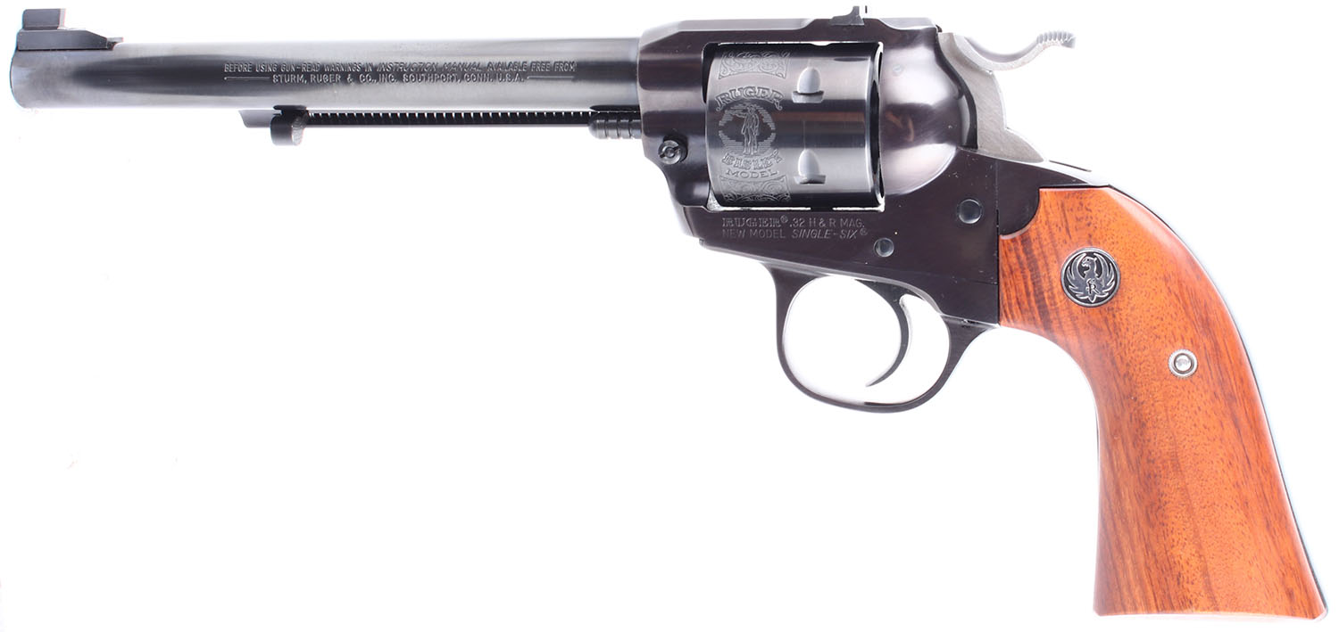 BOXED Ruger, New Model Single Six Bisley, CAL: 32 H&R MAG. MFG: 1986. SN: 650-19148, Single Action Revolver. 6 1/2 barrel. The factory wood grips with Ruger medallions are in excellent condition. The bluing rates 98% with light rust speckling. The cylinder has factory engravings. Bore is excellent. Mechanically solid, the cylinder has very little side to side & back & forth play. Blacked out target sights, the rear sight is set in a dovetail cut on the frame, the serrated front sight is screwed to the barrel. Comes in a factory Ruger cardboard box with an owners manual and other related paperwork. FFL Req. - Value: 650 to 950