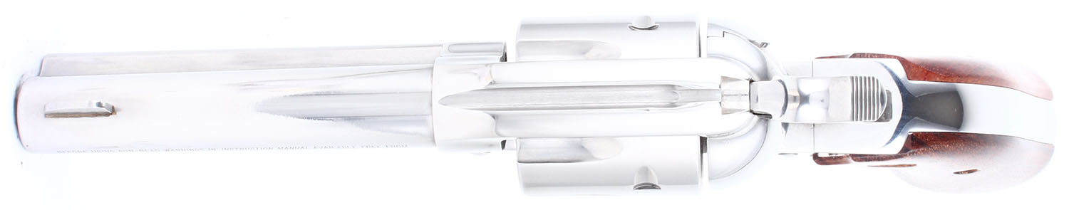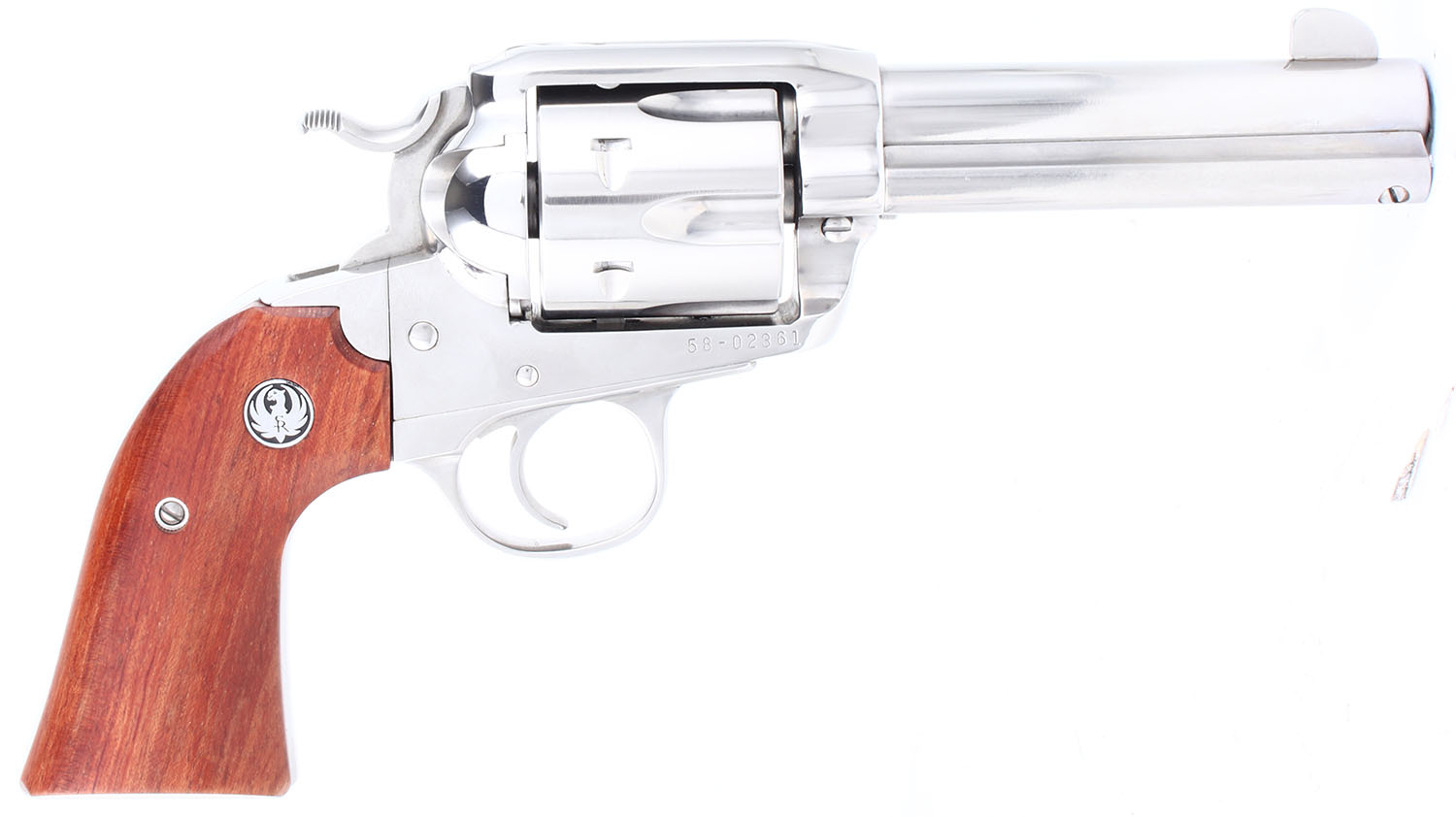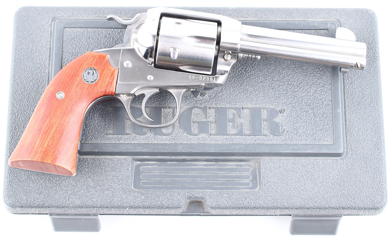CASED Ruger, Vaquero, CAL: 44 MAG. MFG: 2001. SN: 58-02361, Single Action Revolver. 4 1/2 barrel. The factory wood grips with Ruger medallions are excellent with very light handling wear. The factory nickeled finish is excellent with very light wear. Bore is excellent. Mechanically solid, the cylinder has some side to side & back & forth play. Rudimentary sights, serrated front blade sight is integral to the barrel, rear trough sight is cut into the frame. Comes in the serially matched factory Ruger hard case with an owners manual and other related paperwork. FFL Req. - Value: 550 to 1100